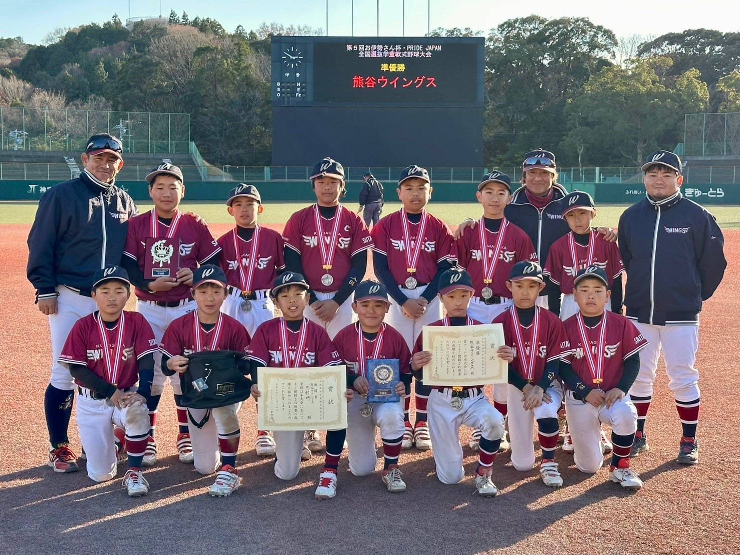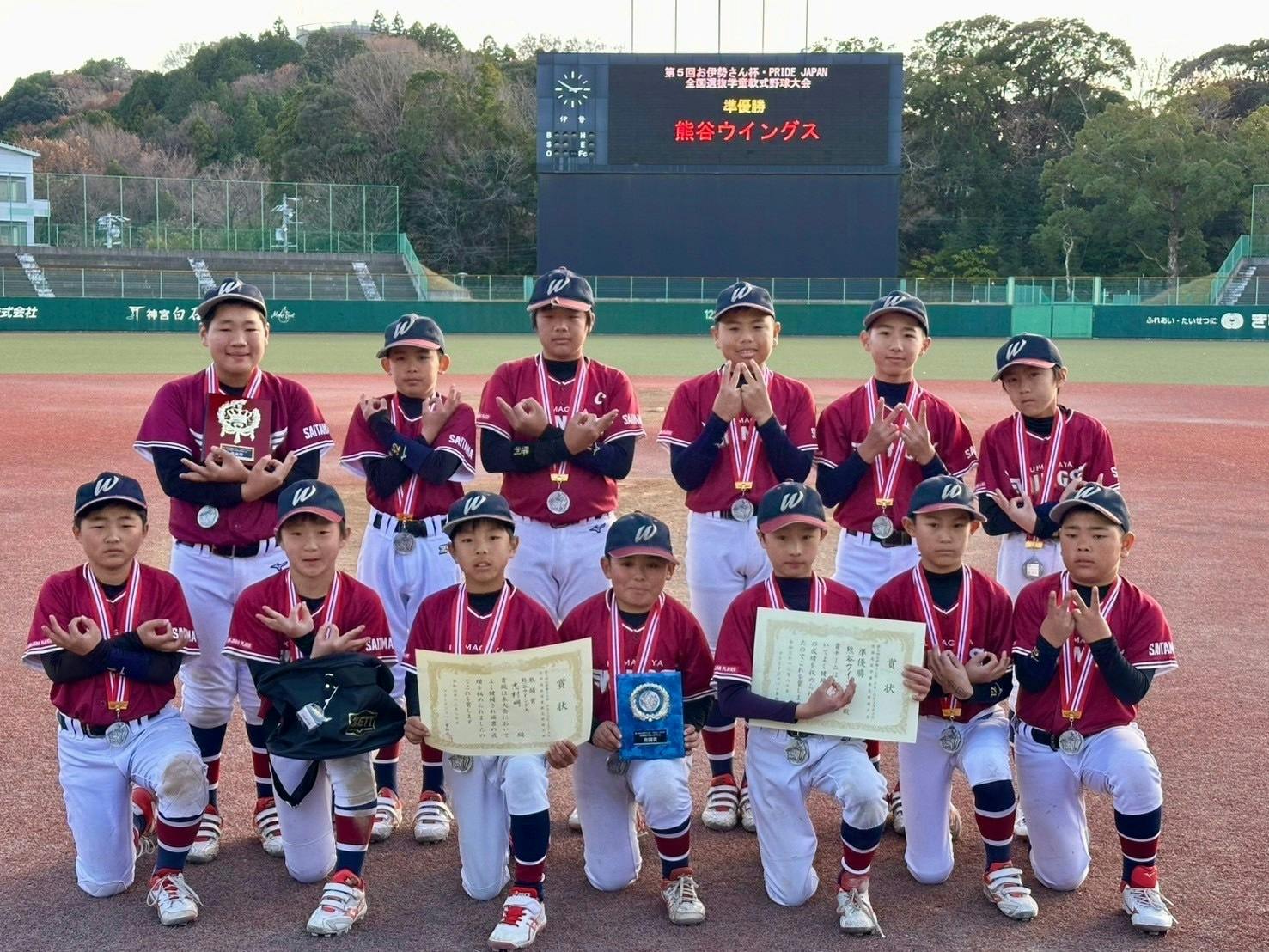 2024/12/29 22:4912月25~27日に三重県伊勢市・松阪市・津市で開催された「第5回お伊勢さん杯PRIDE JAPAN全国選抜大会」で、熊谷ウィングスは準優勝という素晴らしい結果を収めることが出来ました!!今までの集大成としてこの大会に並々ならぬ準備をしてまいりましたが、全国大会で2位という結果に驚きと喜びが入り混じっています…!熊谷ウィングスとして合計5試合を戦いましたが、いずれの試合もかなり厳しく勝てた試合も何とか紙一重という展開でした。ただいつものウィングスらしく、先制点を取られても決して諦めずに逆転の流れに持っていけた所が勝因の一つだったと言えます。この大舞台でそれが出来た事は改めて選手達の成長を感じた所でもあります。今回試合をさせて頂いた 香寺クラブジュニアさん(兵庫県)、東川大雪少年野球クラブさん(北海道)、ウェストベアーズさん(愛知県)、大阪オールスターズJr.さん(大阪府)、木津ブライトさん(愛知県)、本当にありがとうございました!非常に強く、素晴らしいチームでした。今回を機に今後また交流をさせて頂く機会があればと思います。また大会敢闘賞としてチームのエースピッチャーである志村明選手が選ばれました!全国の強豪相手に逞しい投球を見せてくれました。今回の大会で熊谷ウィングスの2024年度の代は最後となります。皆さまの温かいご支援のおかげで、選手たちを全国大会という大舞台に連れて行くことができました。本当にありがとうございました!選手たちは皆さまの応援を胸に、全力で戦い抜きました。この経験は彼らにとって大きな成長の糧となり、これからの人生の自信となると思います。改めまして今回のご支援ありがとうございました!*返礼品の発送等はまたご連絡させて頂きます もっと見る