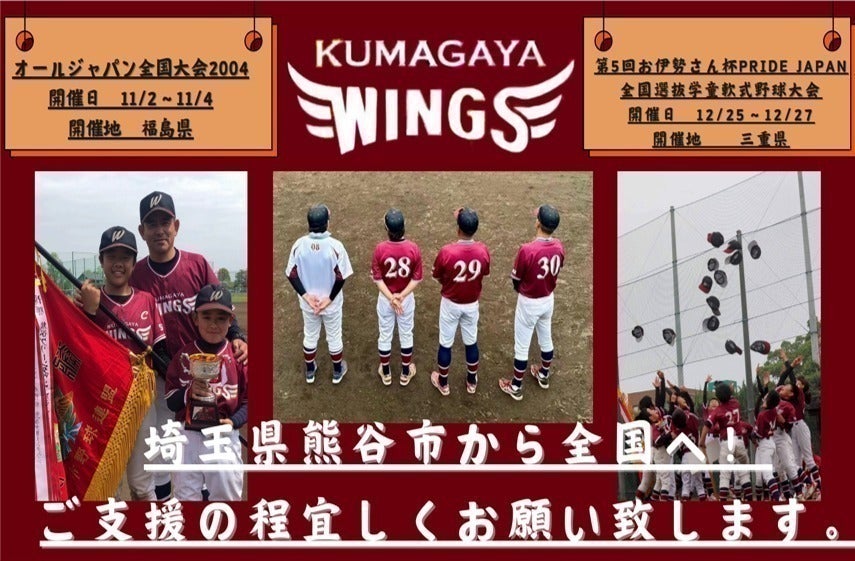 オールジャパンベースボールリーグ小等部2024全国大会、第5回お伊勢さん杯PRIDE JAPAN全国選抜学童軟式野球大会と2つの全国大会に出場するにあたり、移動費、現地滞在費の費用概算は300万円を見込んでおります。熊谷ウイングスでは「保護者の負担を少なく」をモットーの一つに運営しており、今まで大会参加費や合宿費の一部も資源回収等で賄ってきておりました。念願の全国大会出場が決まりましたが費用は今まで通りでは賄う事は出来ず、何か出来る事は無いかと思い、今回のプロジェクトを立ち上げるにいたりました。