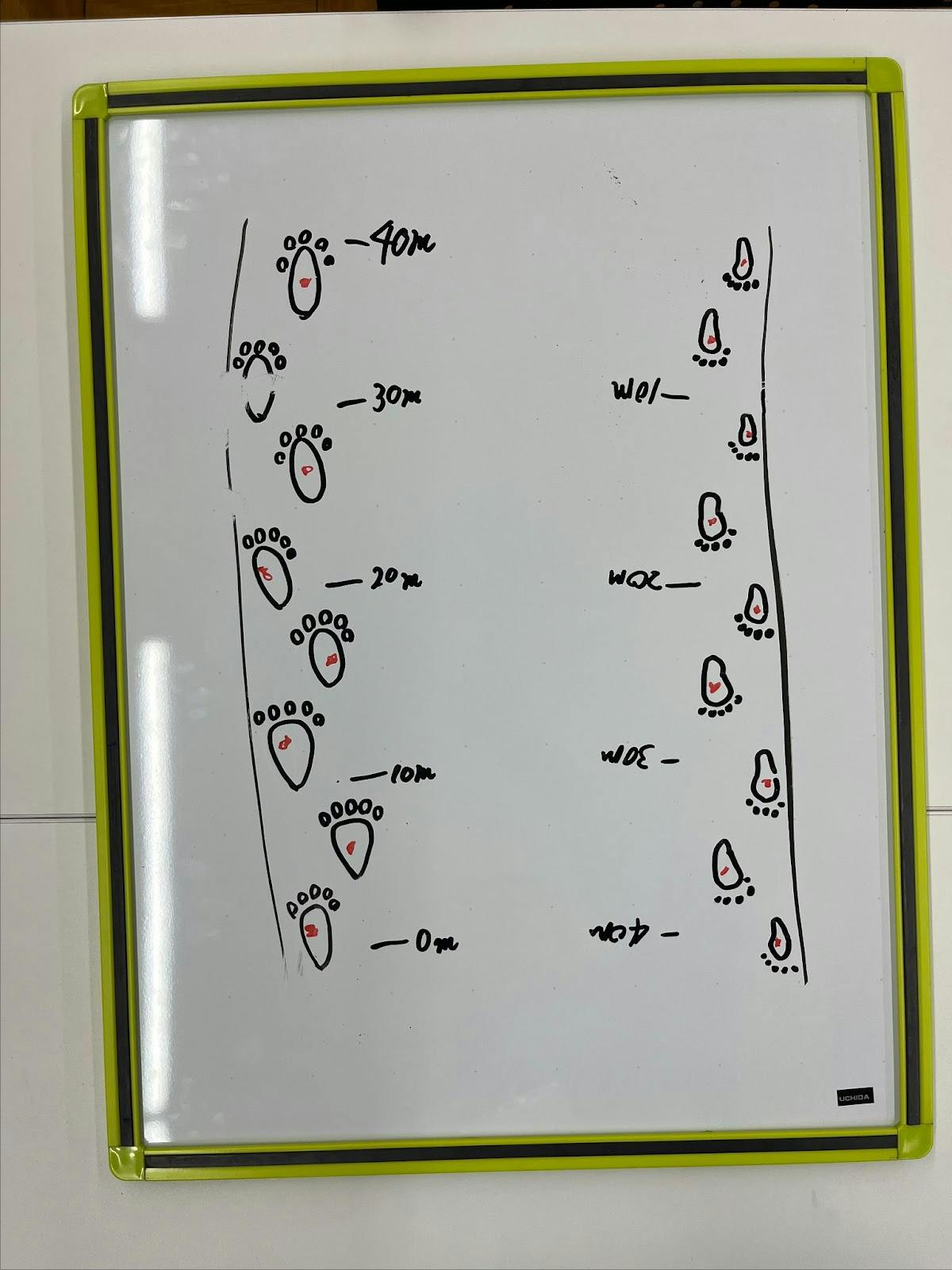 車のライトを蓄光・反応するような蓄光パネルを健康的な歩幅で足跡型に設置する。