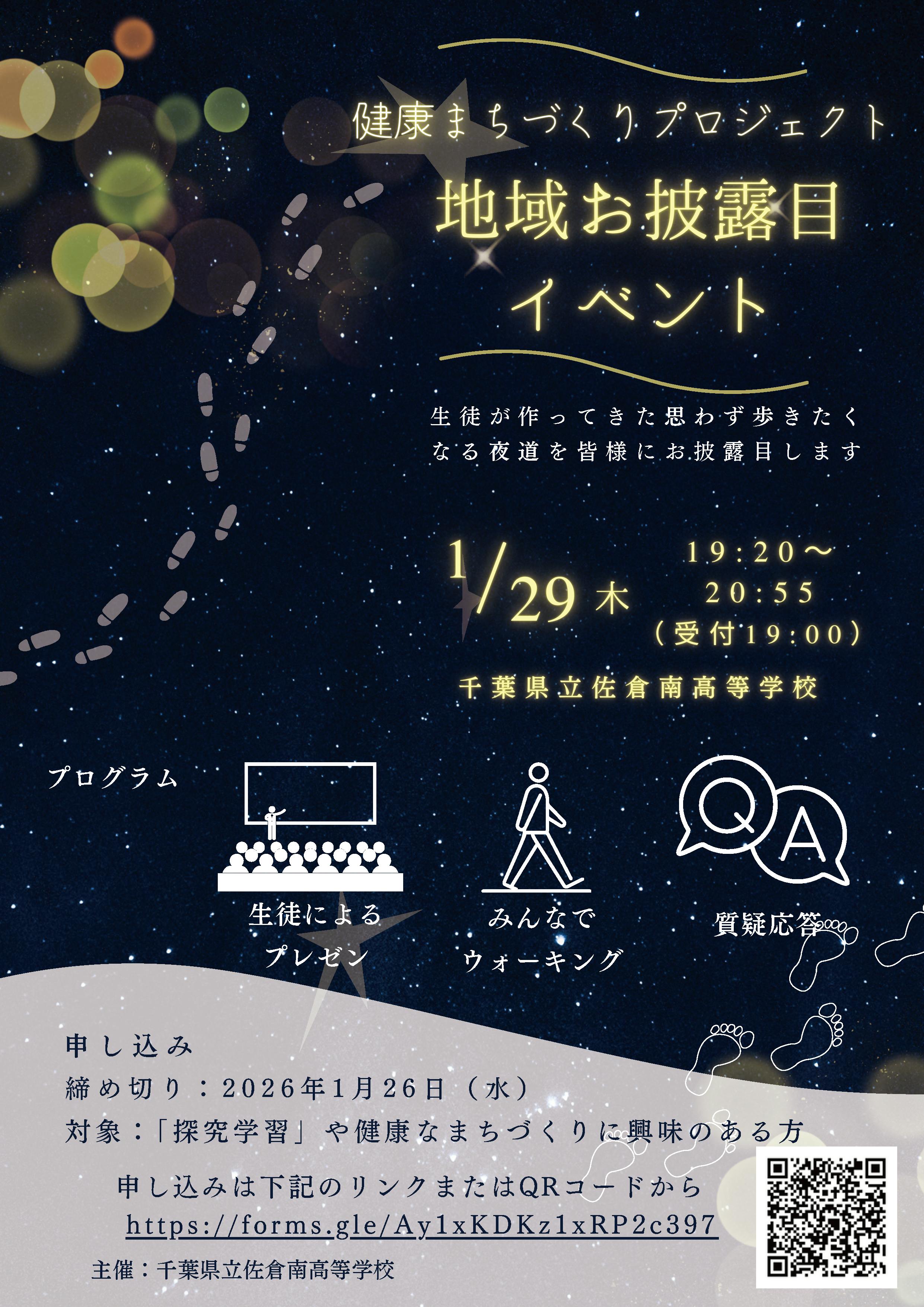 2026/01/26 15:001月29日(木)に、生徒が作ってきた「思わず歩きたくなる夜道」をお披露目するイベントを開催いたします。当日は、生徒たちが自らの言葉でプロジェクトの軌跡を発表し、天候が良ければ実際に整備した歩道を一緒にウォーキングする予定です。参加締め切り日を5日間伸ばしました。ご参加いただける方は、1月27日(火)までにGoogleフォームへご入力いただけますと幸いです。※12月12日にお送りした内容と同様のイベントです。===イベントの概要は以下の通りです。1. 日時 : 令和8年1月29日(木)午後7時20分から8時55分まで(受付は午後7時00分から)2. 場所 : 本校体育館および学校前の歩道、来賓用玄関で受付を済ませてからお入りください。3. 内容 : (1)「健康まちづくりプロジェクト」3年間の歩み(2)晴天の場合 ストレッチ後に歩道を生徒とともにウォーキング 雨天の場合 体育館にて別途活動を予定4. 広報 : メディアからの取材と一般社団法人Spiceの広報担当による撮影がございます。撮影不可の場合はその旨を受付にてお伝えください。5. 参加 : 参加希望の方は下記リンクより御出席される方のご氏名、組織名・役職、交通手段等を御記入ください。(締切:令和8年1月27日(火))https://docs.google.com/forms/d/e/1FAIpQLSfgKwgxe9ZfMacLis1AivMrnIjET3TUti0uyFKzjY11vH5gpg/viewformみなさんのご参加をお待ちしております。 もっと見る