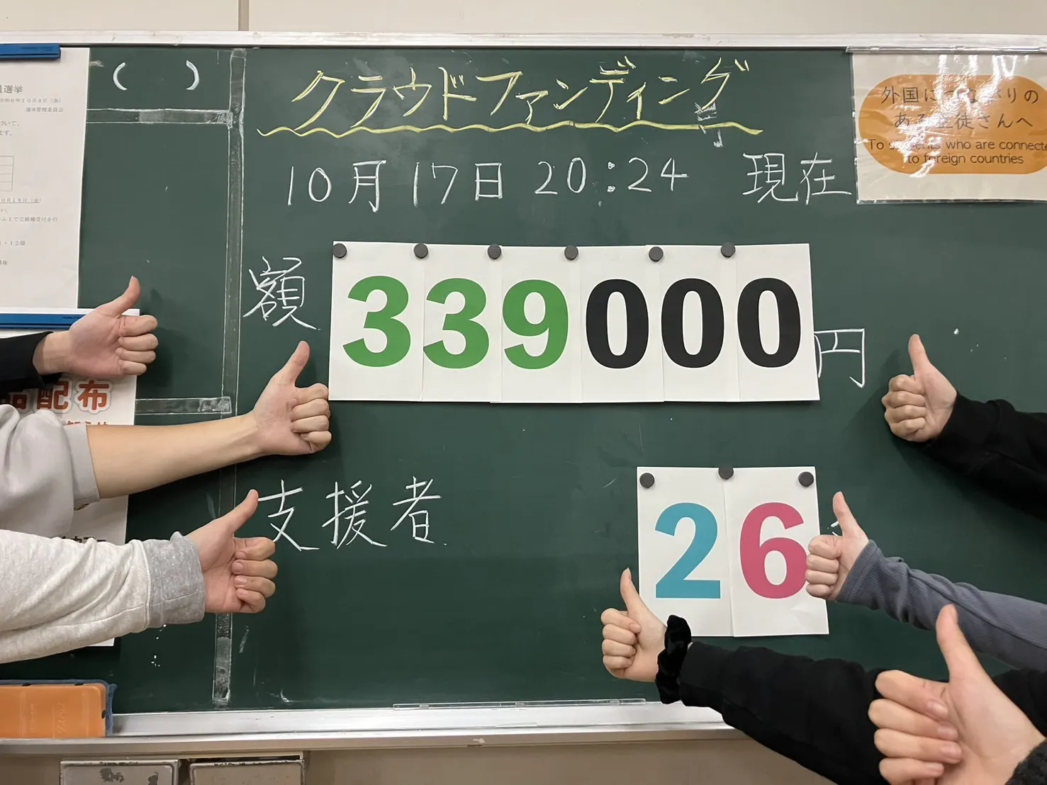 教室後ろにある黒板を使って、今のクラファン状況が見える化されています !