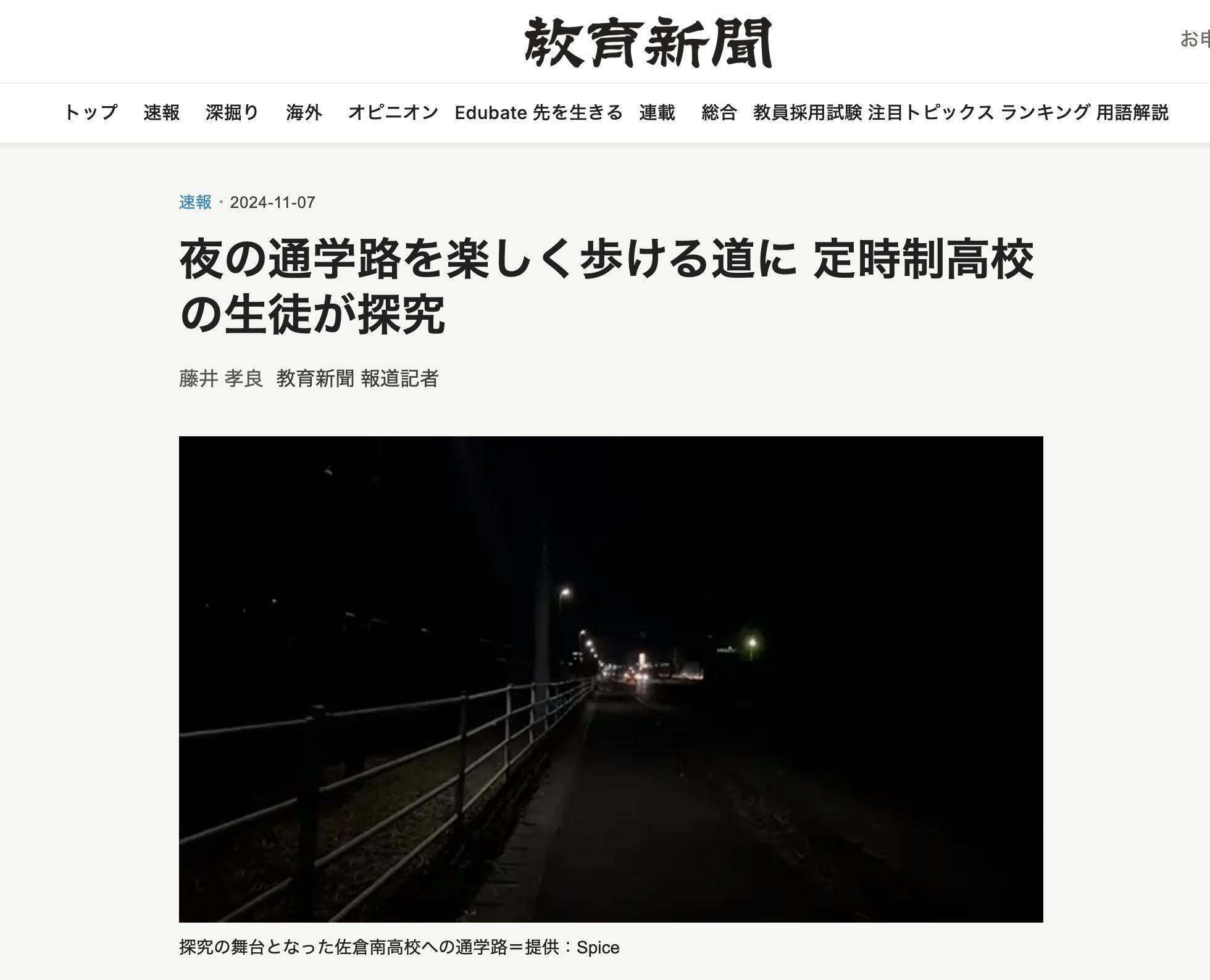 記事のタイトルは「夜の通学路を楽しく歩ける道に 定時制高校の生徒が探究」です。