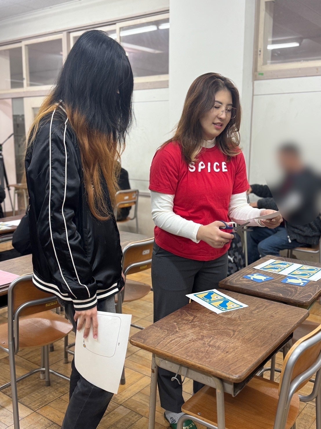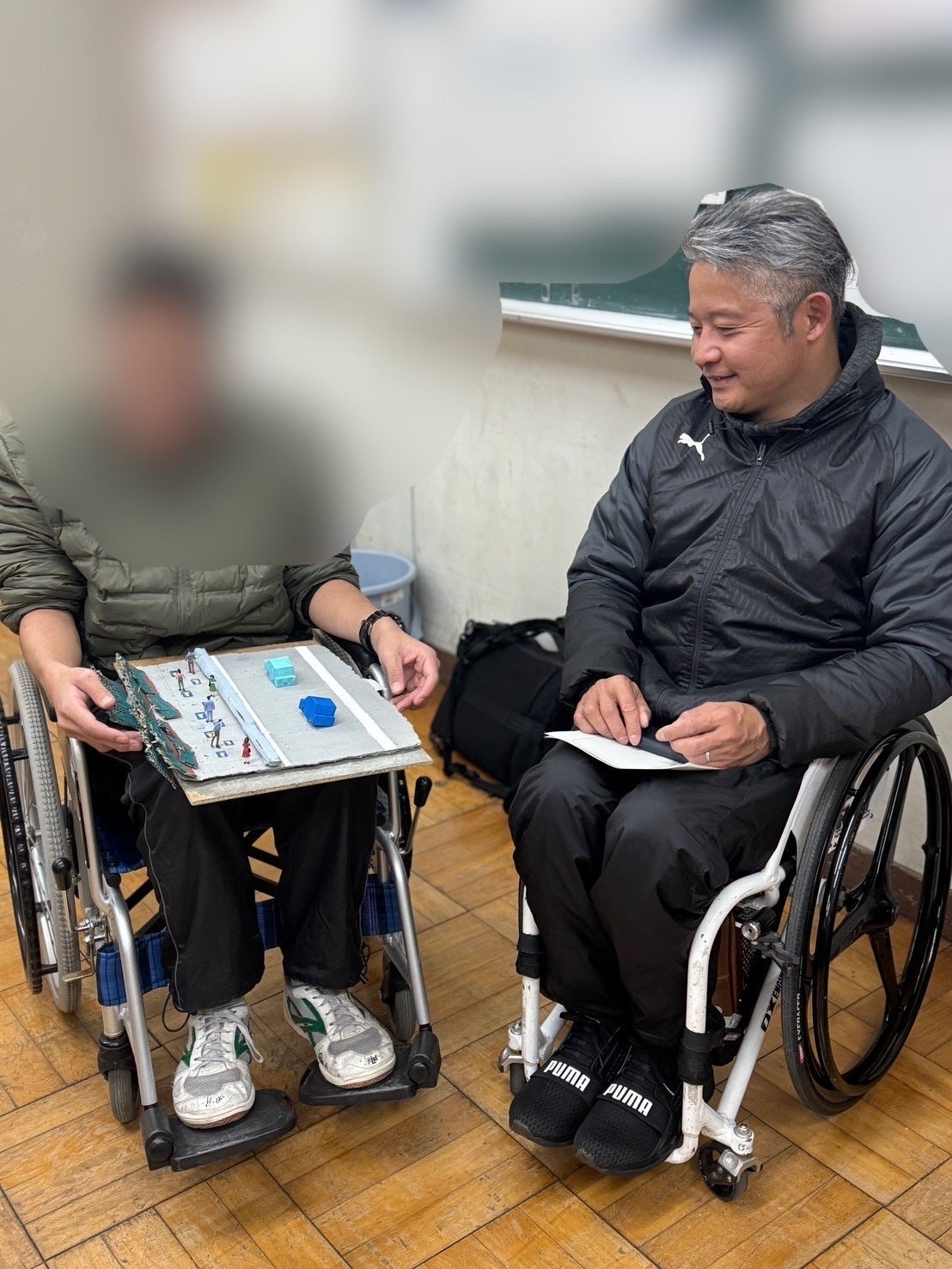 この日も車椅子を教室の後方に準備していたら、何人かの生徒が使っていました。すっかり馴染んでます。