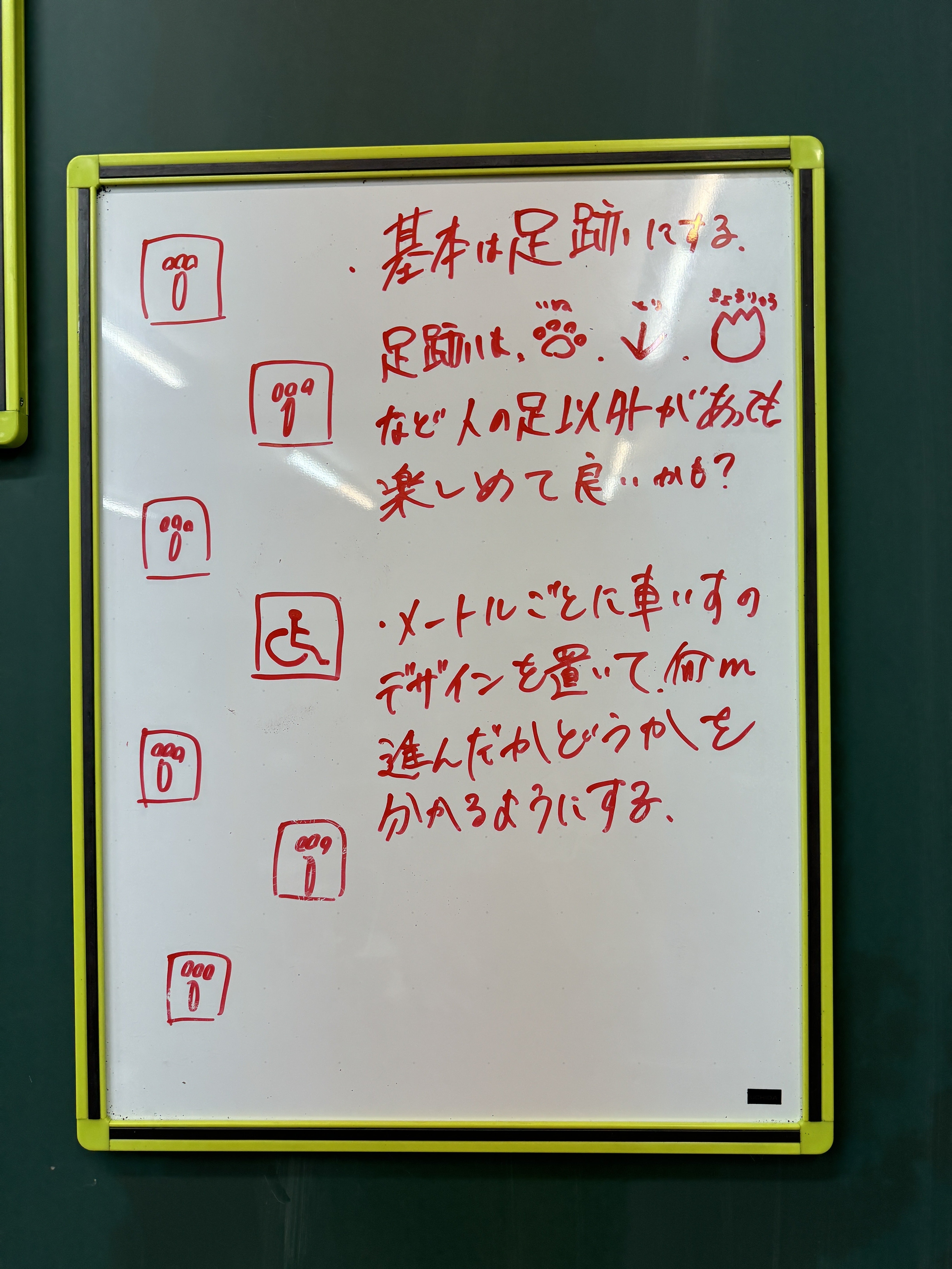事前にサンプル品として注文していた蓄光パネルに加え、ほぼ原寸大のサイズに印刷した足跡パネルを触りながら考えてました。