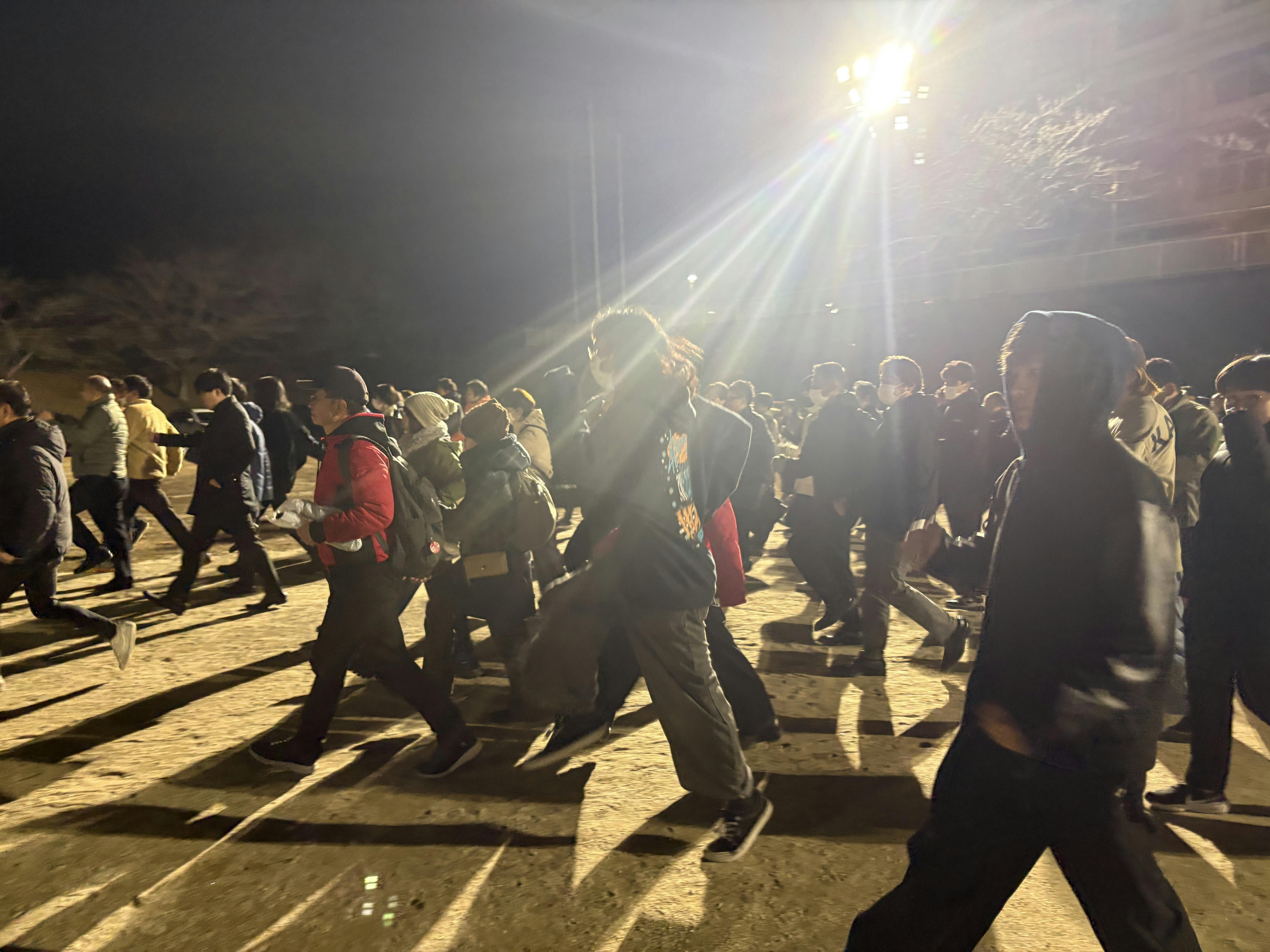 その後、生徒も参加者も全員で外に行き、運動場で軽いストレッチをした後、蓄光パネルが貼られた夜道へと進みました。