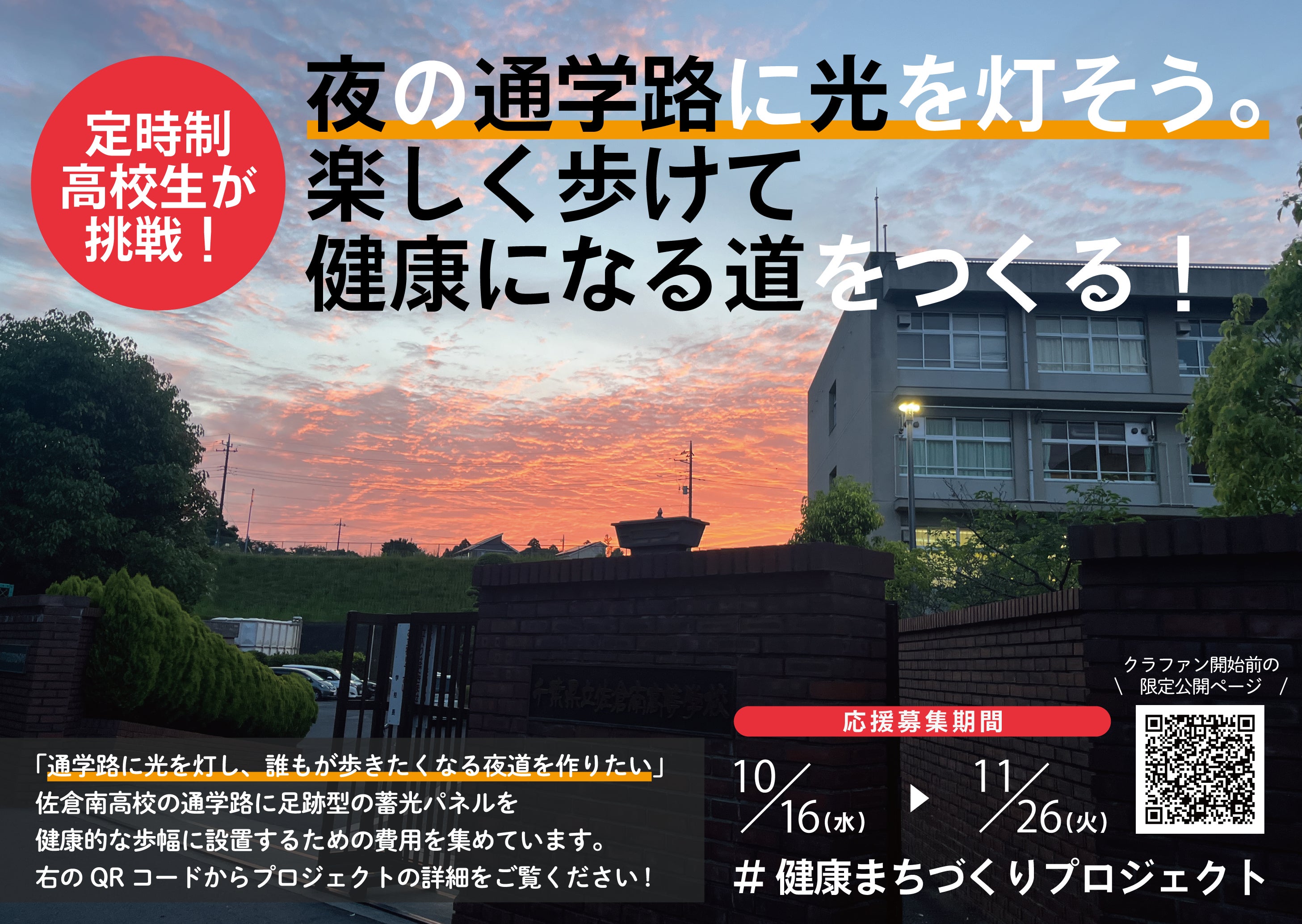 皆さま、こんにちは!一般社団法人Spiceの郡司日奈乃です。千葉県立佐倉南高校の定時制夜間部の高校生たちと一緒に取り組んでいる「健康まちづくりプロジェクト」のアイデアを社会実装するために、クラウドファンディングを立ち上げました! 「通学路に光を灯し、誰もが楽しく歩けて健康になる夜道を作りたい。」県立佐倉南高校の通学路に、足跡型の蓄光パネルを健康的な歩幅で設置するための費用を集める挑戦です。▼プロジェクトページのリンクhttps://camp-fire.jp/projects/798305/view▼プロジェクトの背景定時制夜間部の生徒たちは、日中アルバイトをしている方が多くいます。「社会人」としての意識を持ちづらいアルバイトの経験からでもなく、授業用に加工された、「お試しの社会」ではなく、本当の「社会」を、自分たちのアイデアや発言で動かせる可能性があること。その力を自分たちが持っていることを知って欲しかったのです。だからこそ、アイデアを実現するまで取り組む意味があると信じ、健康まちづくりプロジェクトをスタートさせました。詳細はプロジェクトページをご覧ください!▼実現したいこと佐倉南高校の生徒たちが考えたのは、蓄光パネルを道に設置し、車のライトが通るたびに足跡が浮かび上がる「楽しく歩ける道」です。これにより、暗い夜道が安心で楽しいものとなり、地域の人々の健康増進にも貢献できると考えています。▼目標金額:50万円ご支援いただいた資金は、蓄光パネルの購入や設置、広報費用に充てられます。▼リターンご支援いただいた皆さまには、感謝の気持ちを込めた特別なリターンをご用意しています。詳細はプロジェクトページをご覧ください!皆さまの温かいご支援とシェアをどうかよろしくお願いいたします!一緒に佐倉市を健康的で楽しいまちに変えていきましょう〜〜〜!!