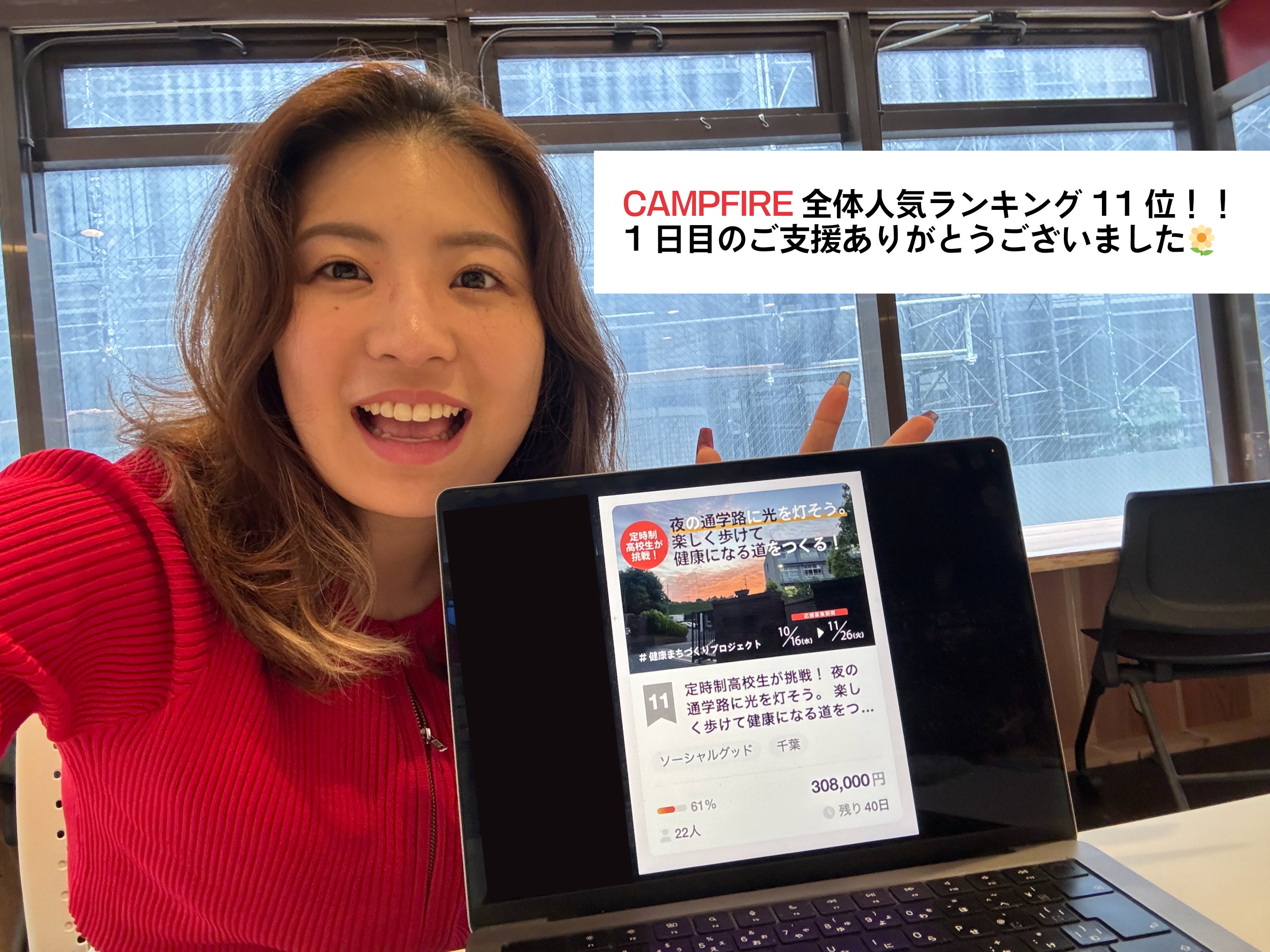 みなさん、こんにちは!健康まちづくりプロジェクト事務局・一般社団法人Spiceの郡司です。クラファン初日が終了し、2日目がスタートしました。クラファン初日にご支援いただいた22人のみなさん、ありがとうございます。そして2日目早朝から支援いただいたお二人も、ありがとうございます・・・ !10/16初日には、約1500PVを獲得し、なんとCAMPFIRE全体人気ランキング11位まで駆け上がりました!!!!!17日午前1:00時点。深夜にものすっっっごくテンション上がりました。高校生たちの反応が楽しみ ! 名だたるプロジェクトの中にランクインさせていただきました。スクショ時点では12位の表記。現在もなお、ソーシャルグッド部門では人気1位にランクインしています !この勢いを落とすことがないように、2日目以降も発信を続けていきます。アカウント登録の壁はありますが、周囲の方にプロジェクトページのお気に入り登録を勧めていただけるとありがたいです・・・ !(お気に入り登録をしてくださった方には、活動報告のメールが届くようになります)11月26日まで、どうぞよろしくお願いいたします!