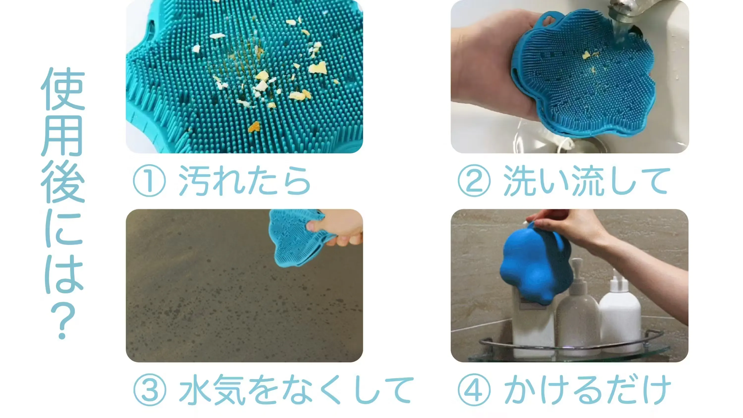 A:使用後にはブラシにシャワーをかけ、汚れが残らないように洗い流してください。その後はよく水を切ってフックなどにかけて保管してください。