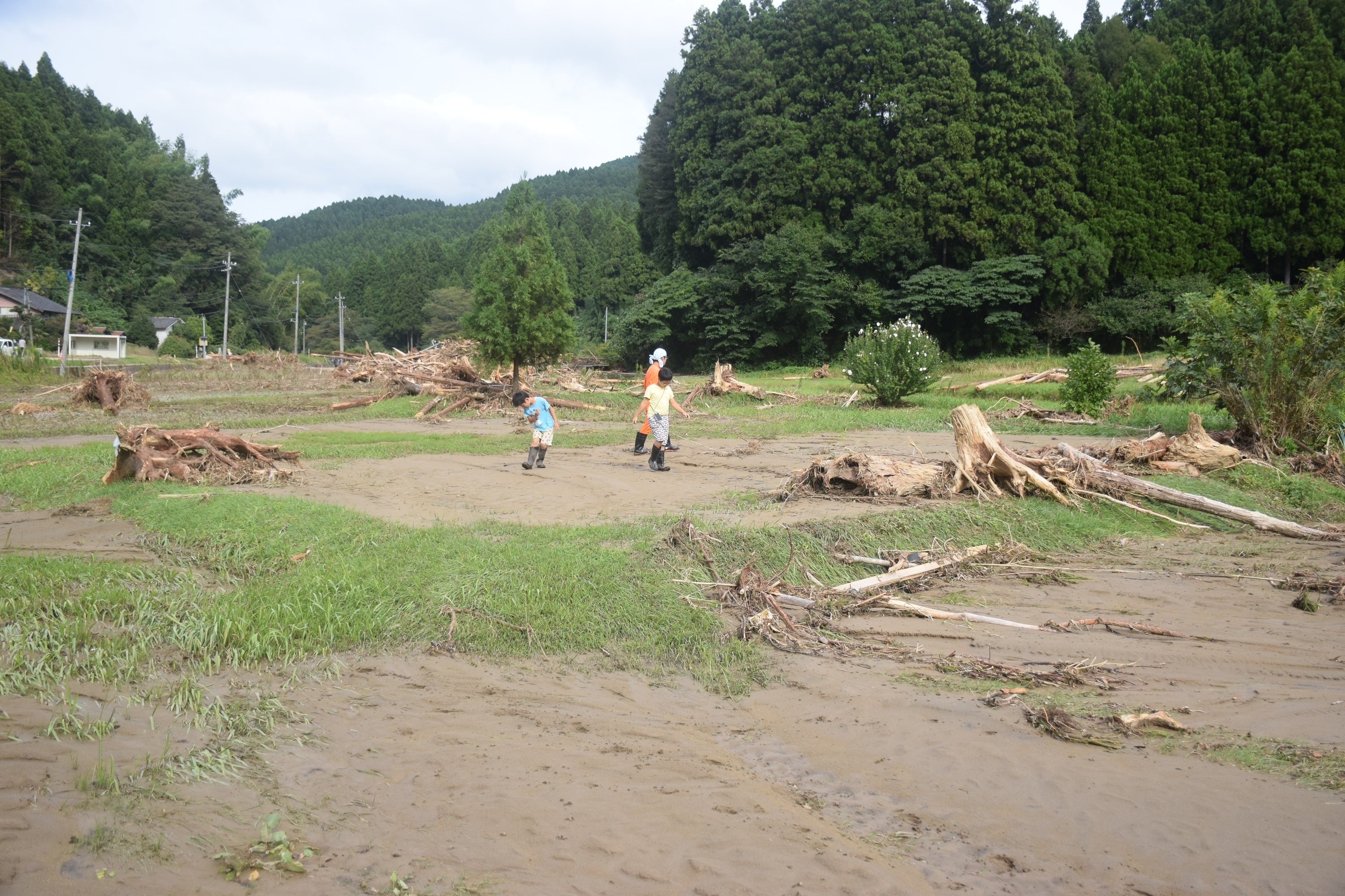 田畑は、流木でおおわれており、家族で小さいものから除去しています。
