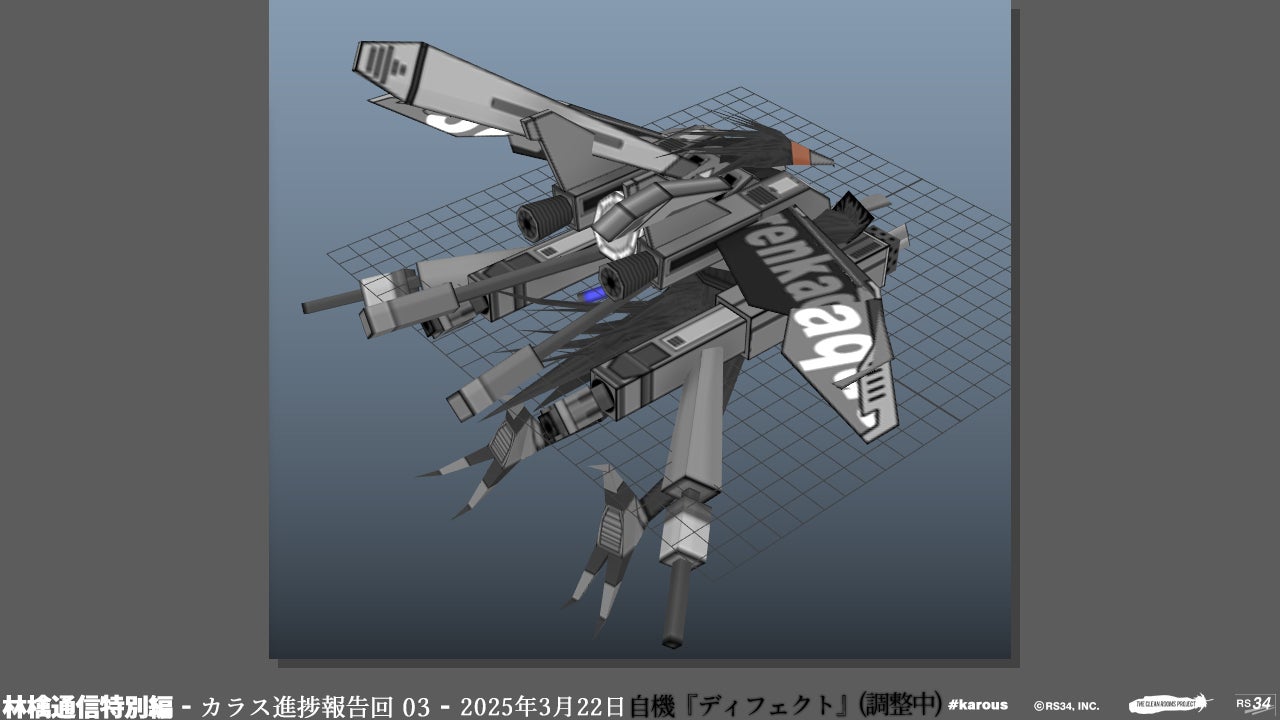 カラスご支援者の皆様いつもありがとうございます。株式会社RS34の中江です 3/22に活動報告として、『林檎通信特別編 - カラス進捗報告回03 -』を放送致しました。ご視聴はこちらから!https://www.youtube.com/live/PTramnQ1A1M?si=8yzcOOBu-MlKNyxT現在の制作進捗内容としては、只今の開発は約35%程度!1ステージを作成中!自機の表示を調整中。自機のモデルを調整中でその模様の一部を上記放送内で取り扱っておりますので詳しくは放送を御覧くださいませ。また、直近の3月と4月のリターンのご案内はこちらとなります3月【プチシークレットライブ】人数限定応募できた方のみ参加できるライブ。上記アドレスより、「カラス進捗報告」パートはご覧いただけます。【スマホPC待ち受けデータ】(3月末予定)4月【アレンジ楽曲DLカード】【カラスシリーズSECD】(4月末頃予定)引き続き「THE CLEAN ROOMS PROJECT」を宜しくお願い致します。