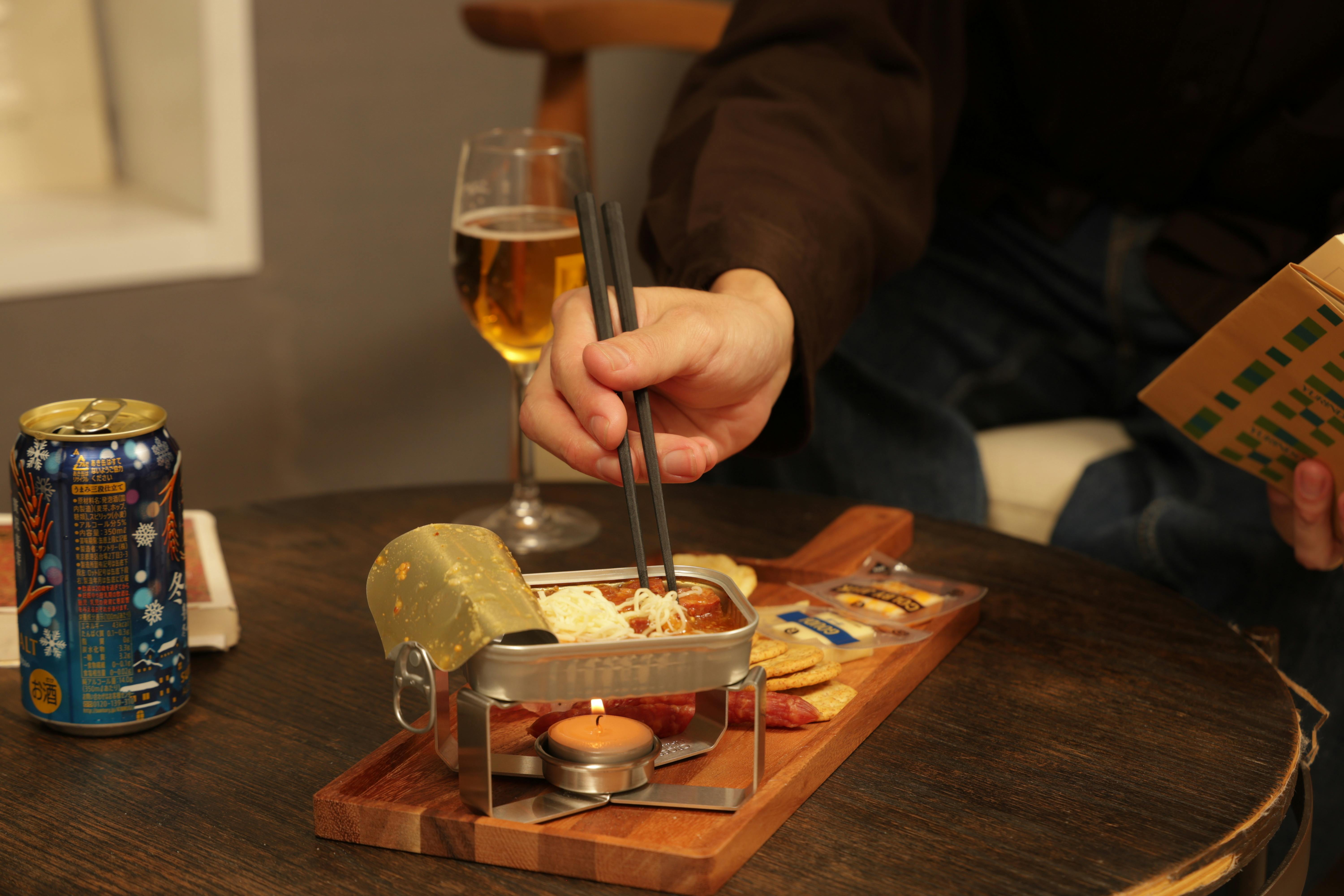 ティーライトキャンドルの柔らかな炎で、缶詰をじっくりと温めます。