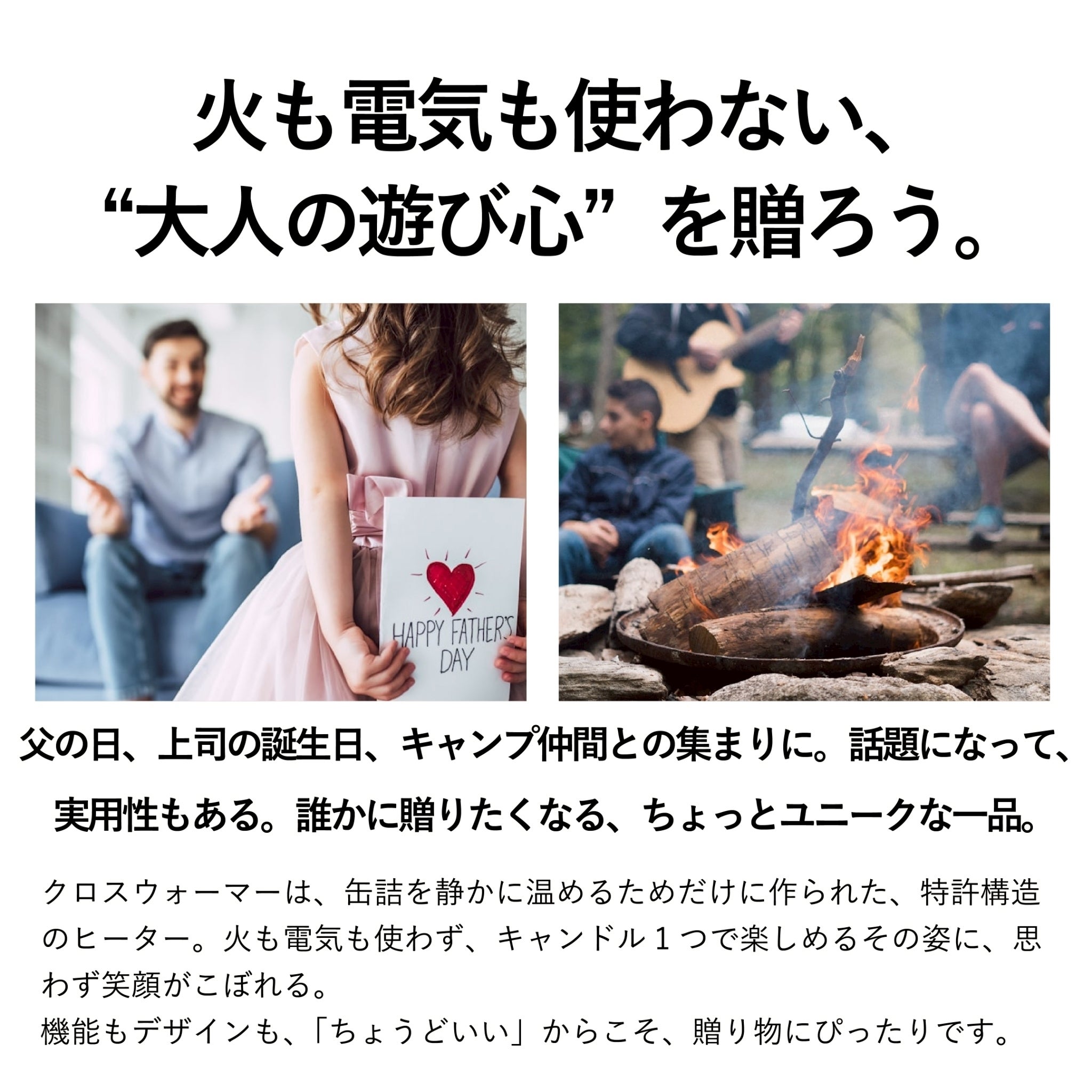 クロスウォーマーは、特許取得の構造により、缶底を直接炎で熱することなく、適度な温かさを長時間維持できます。また、飲み物を温める際にも、耐熱容器を使えばホットコーヒーや熱燗などを美味しく保てます。大勢で囲む食事やアウトドア、さらには防災キットにも最適です。