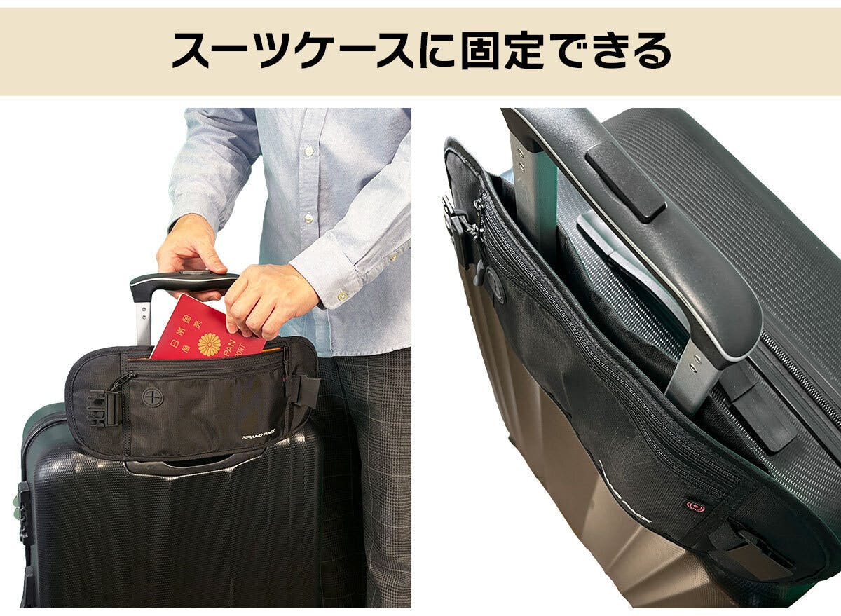 脱着可能なベルトを外し、スーツケースのハンドルに通して固定できるキャリーオン機能付き。パスポートや搭乗券をサッと取り出せるので搭乗手続きもスムーズ。
