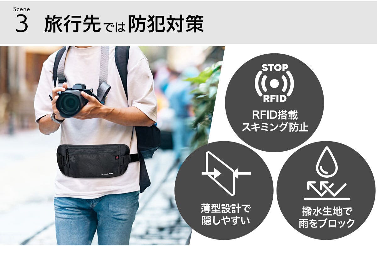 薄さわずか0.8cmで服の下に隠せるので防犯対策に優れています。さらにRFID機能搭載でクレジットカードのスキミングを防ぎ、貴重品をしっかり守ります。