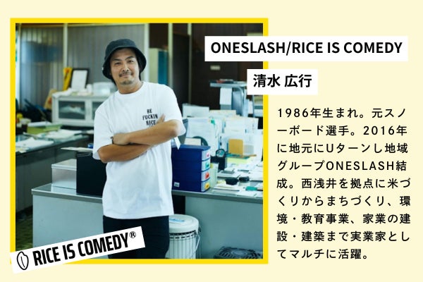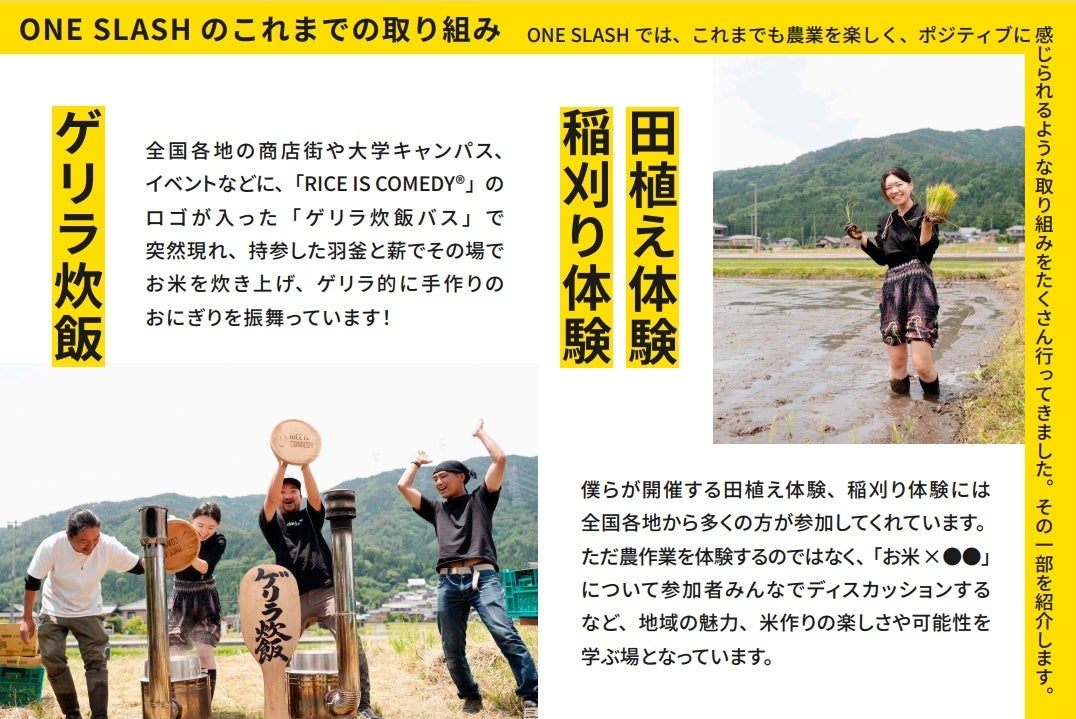 2016年に結成したONE SLASHは、地域のネガティブをポジティブに変え、地元を盛り上げるための活動を続けてきました。地元の春祭りの再興やゲリラ炊飯、RICE IS COMEDY®︎というユニークな米づくりの取り組みは、僕たちが楽しみながら地域を活性化するための仕掛けです。