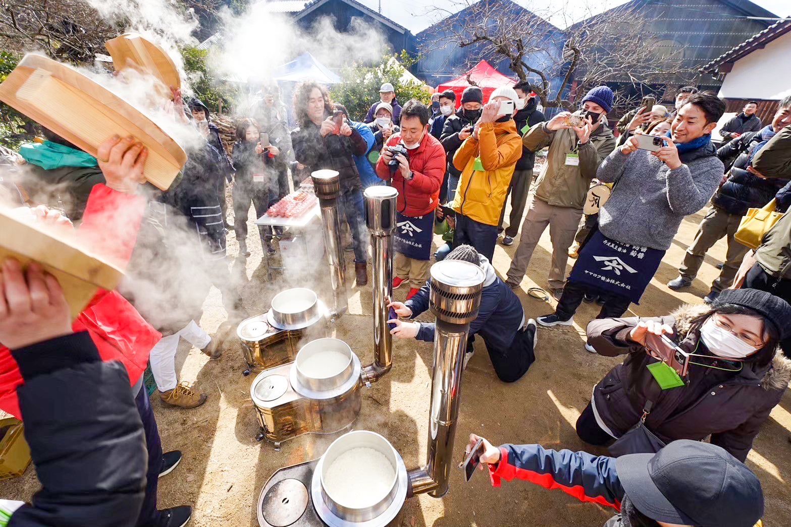 そしてこの農業をもっと面白く、楽しくするために生まれたこのコンセプトを体現した象徴的なイベントが「ゲリラ炊飯」です。羽釜の香りに、みんなが集まるゲリラ炊飯。炊きたてのお米に感動する笑顔が広がった瞬間。羽釜でお米を炊き、その場でおにぎりを振る舞うというユニークな取り組みを、長浜市の黒壁スクエアで初めて開催し、子どもから大人まで多くの人に喜んでもらいました。米を炊く香りや味に感動する人々の姿を見て、僕たちは農業が人々に与える力を実感。