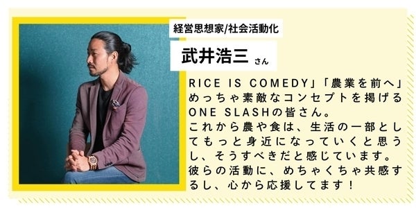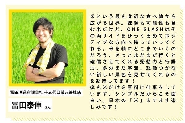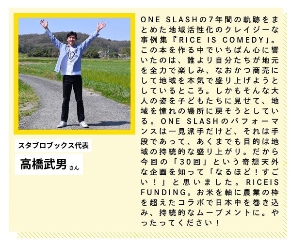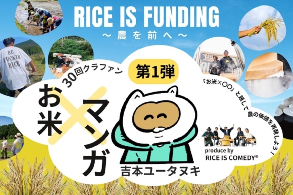 ついに始動!ONE SLASHの30回クラウドファンディングがスタートします!合言葉は「RICE IS FOUNDING 〜農を前へ〜」。その記念すべき第1弾は、滋賀県を拠点に活躍する人気マンガ家・吉本ユータヌキさんとのコラボ!お米の魅力をユーモアたっぷりに描いた物語が誕生!初めまして!ONE SLASHです!僕たちは、琵琶湖の最北端に位置する長浜市西浅井を拠点に、地元の仲間たちと「RICE IS COMEDY®(ライスイズコメディ)〜米作りは喜劇だ〜」という農プロジェクトを通して、ネガティブなイメージを持たれがちな農業を、楽しくポジティブなものとして伝えられるよう、さまざまな活動を行っています。
