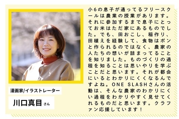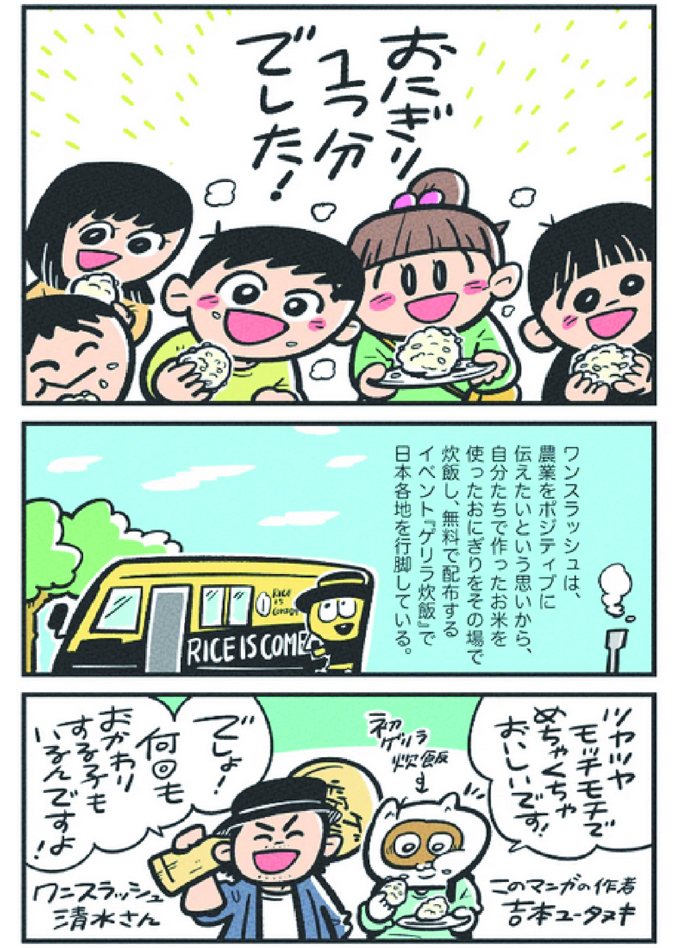 30回クラファンの開催スケジュールは以下の通りです。農業の魅力をみんなで盛り上げて、それだけにとどまらず、ネガティブにポジティブに変えれるような未来に繋げる大きなムーブメントを一緒に作りましょう!記念すべき30回クラファン第1弾は、お米×マンガです! マンガという親しみやすいメディアを通じて、農業に関心を持つきっかけを提供し、農業のポジティブな側面を伝えます。この作品は、単に読むだけではなく、読者が共感し、次のプロジェクトにも参加したくなるような仕掛けを意識しています。今後、マンガは他のプロジェクトと組み合わせたリターンや商品として販売する予定です。完成したマンガの1コマ協力してくれるのは、マンガ家で作家の吉本ユータヌキさん。『あした死のうと思ってたのに』 『「気にしすぎな人クラブ」へようこそ』などの著作が話題の吉本さんは、ONE SLASHの拠点と同じ滋賀県在住。「いつか、滋賀に貢献できる仕事がしたかった」という思いもあり、今回一緒に「お米×マンガ」に取り組んでくださることになりました!吉本ユータヌキさんには、「お米×マンガ」を描くにあたって体験された田植えについてなど、率直な感想を語っていただきました。
