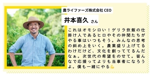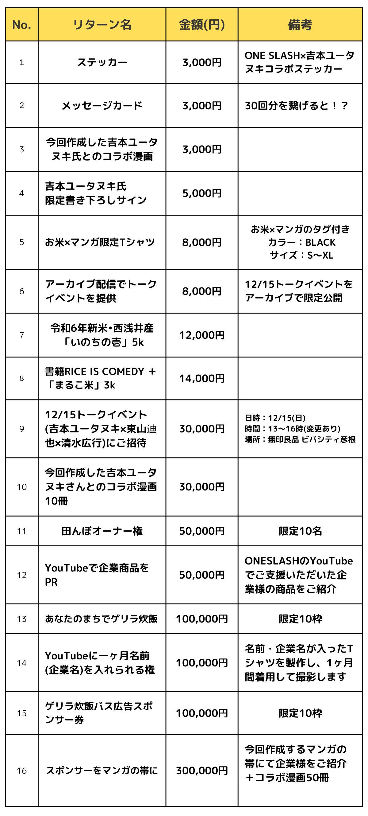 吉本ユータヌキさん:今回の農業体験は、僕にとってすごく貴重な経験でした。農業の大変さも魅力も知ることができましたし、何よりも実際にやってみることで、考え方が大きく変わりました。支援してくださった皆さんには、ぜひ一度近くの田んぼを見てみてほしいです。田んぼを見ると、きっと何か新しい発見があると思います。リターンは、以下の通りです。ゲリラ炊飯など参加者の皆さんが楽しみながら農業の価値に触れることができる内容も揃えておりますので、ぜひご支援よろしくお願いします!
