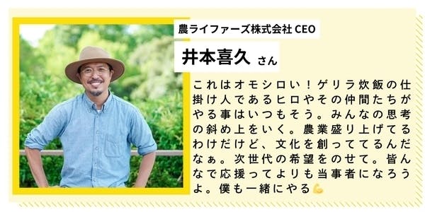 30回クラファン企画は、1次産業の価値を再認識し、農業に新たな光を当てるためにスタートしました。単発で終わらず、全国各地の方とコラボし続けていくことで、農業の価値を点から点線、点線から線、線から面、面から立体でつなげ、持続可能なムーブメントに成長させたいと考えています。