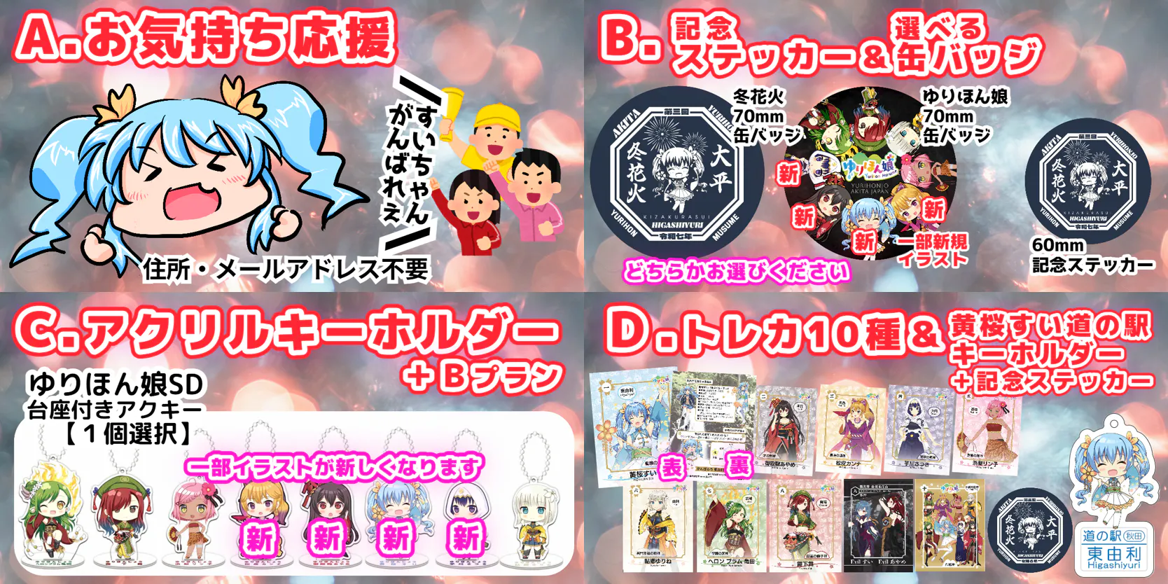 6600円-D.ゆりほん娘トレーディングカード&黄桜すい道の駅キーホルダー ①ゆりほん娘トレーディングカード全10種(×1) ②道の駅東由利黄桜すいキーホルダー(×1) ③記念ステッカー(×1)
