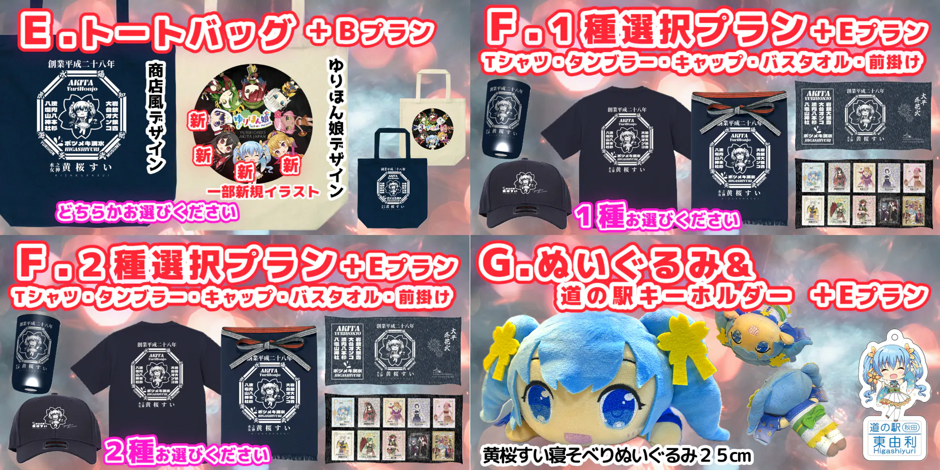 29800円-F.2種選択プラン ①Tシャツ(紺)・タンブラー・キャップ・バスタオル・前掛けの中から2種(×1) ②トートバッグ(×1) ③缶バッジ(×1) ④記念ステッカー(×1)【仲良しメモ帳(×1)追加】