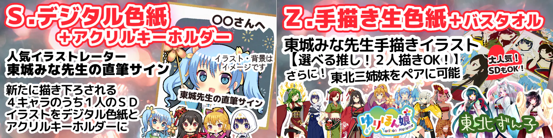 64900円-Z.東城みな手描き生色紙+バスタオル ①ゆりほん娘・東北ずん子3姉妹の中から2キャラ選べるの東城みな先生の手描き生色紙(×1) ②ゆりほん娘トレカ風バスタオル(×1) ③ゆりほん娘トレーディングカード10種(×1) ④缶バッジ(×1) ⑤記念ステッカー(×1)【仲良しメモ帳(×1)追加】