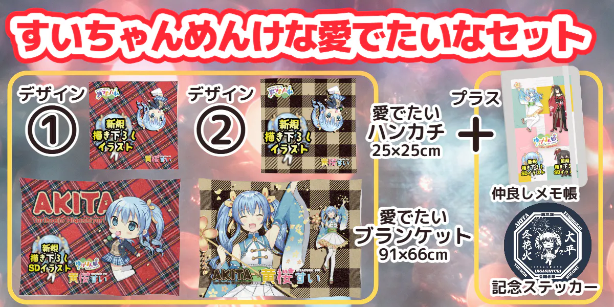 15400円-【すいちゃんめんけな愛でたいなセット】 ①ソフトブランケット(×1) ②ミニハンカチタオル(×1)※黄桜すいの新規SDイラスト ③仲良しメモ帳(×1)※黄桜すい・御殿鞠あやめの新規SDイラスト ④記念ステッカー(×1)