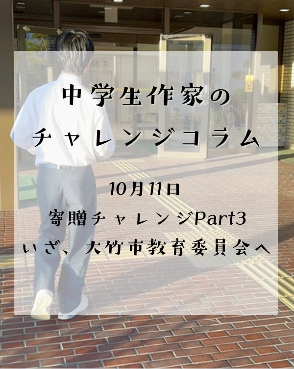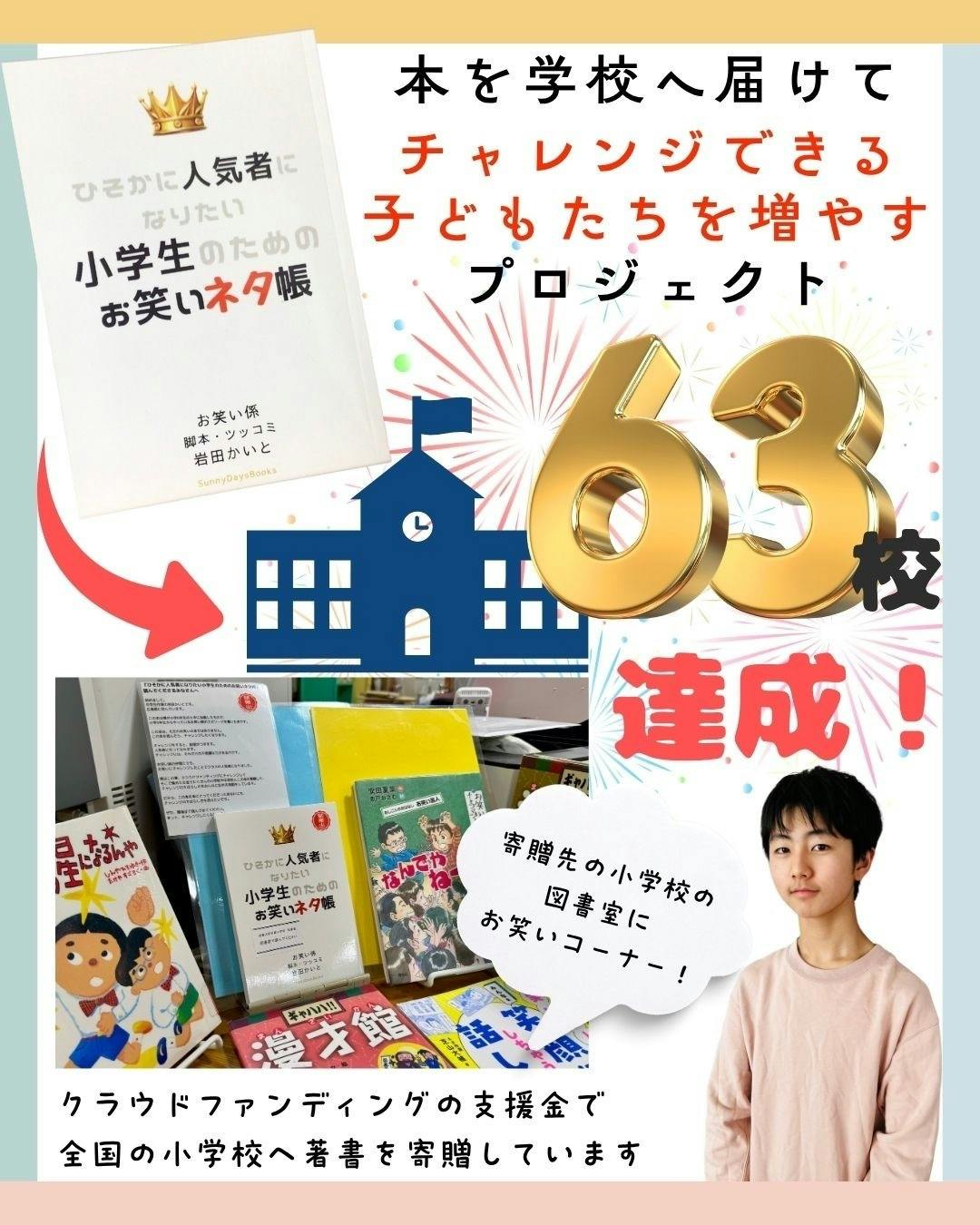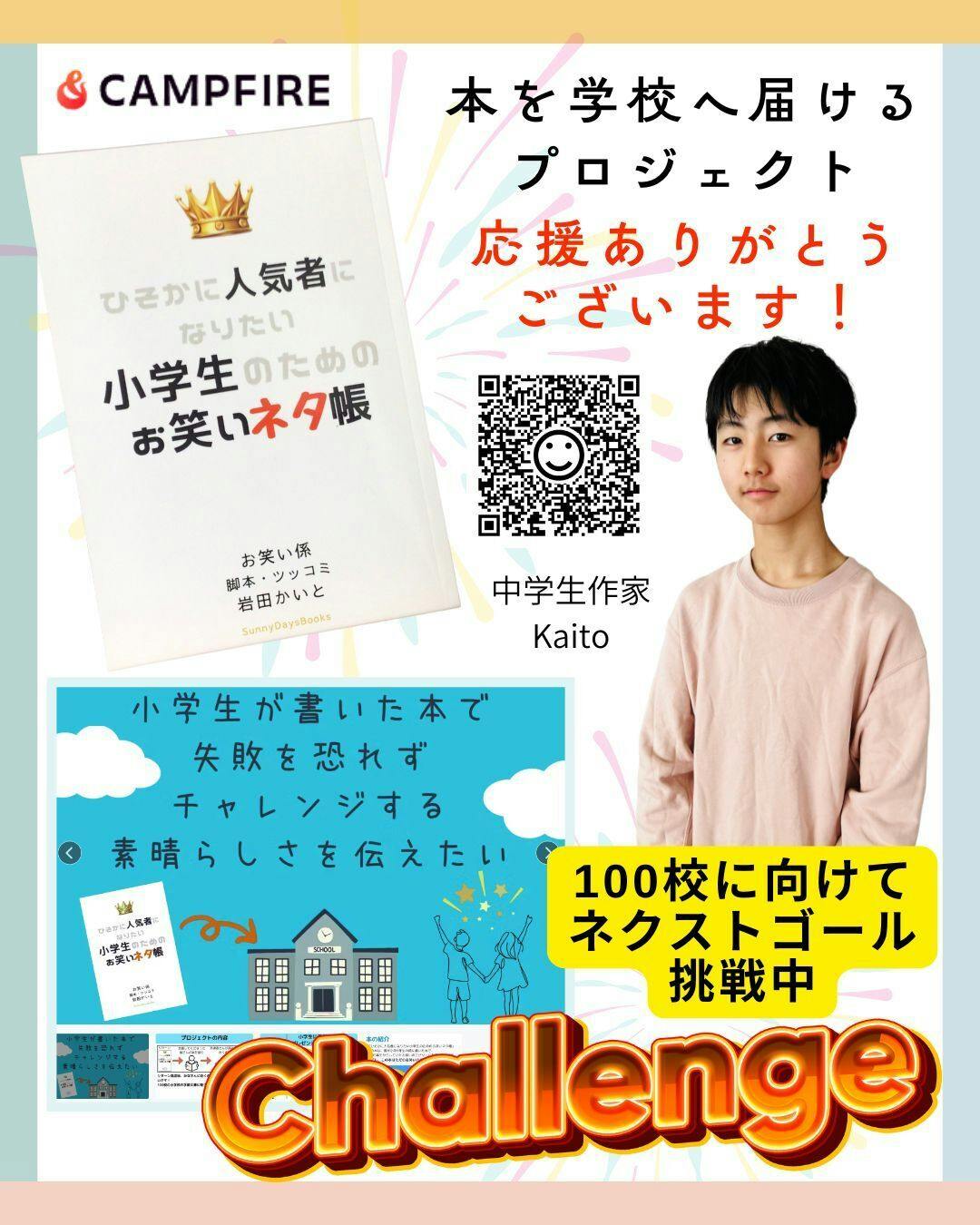 2025/10/23 21:5010月22日 63校、ありがとう!みんな〜!元気ー?中学生作家のかいとです。突然ですが、活動報告します!僕の本をなんと、63校の小学校に寄贈できました!寄贈を受け入れてくれた全国の小学校の教員の皆様、クラウドファンディングで僕を応援してくださった皆様、ほんとうにありがとうございました!寄贈先の先生たちから、あたたかいメッセージをいただきました。「やる気を形にする、言葉にするというのは、大きな力に変わるもんだと気付かされました。」「燃え盛っている子どものやる気には驚かされ、感動させられることも多いと改めて気づきました。」ほんとうに感動しますね。だれかに応援されるっていいことですね。チャレンジは1人ではできない!チャレンジする僕がいて、それを応援してくれている人たちがいるから、チャレンジすることができます。みんな、いつもありがとう!皆さんのあたたかい応援のおかげで、僕は今日も生きています。そしてこれからも、僕はどんどんチャレンジして、みなさんにチャレンジパワーを伝えていくので、応援よろしくお願いします! もっと見る