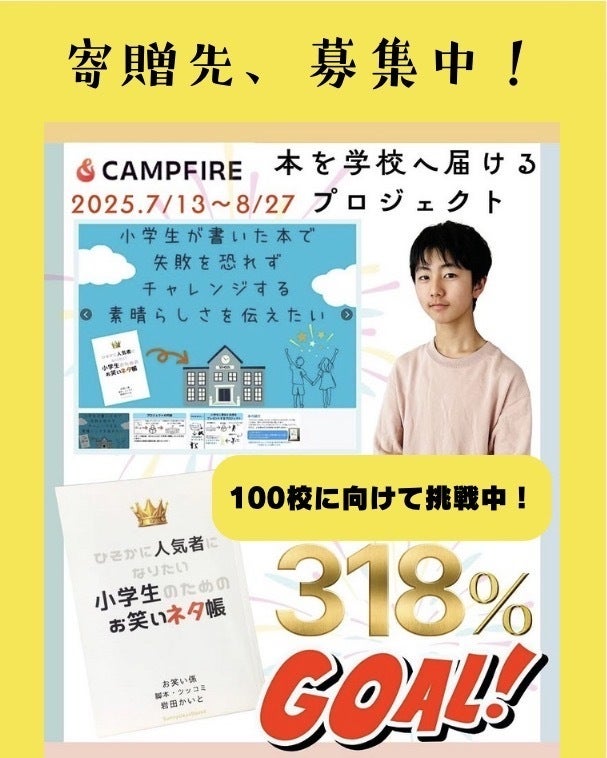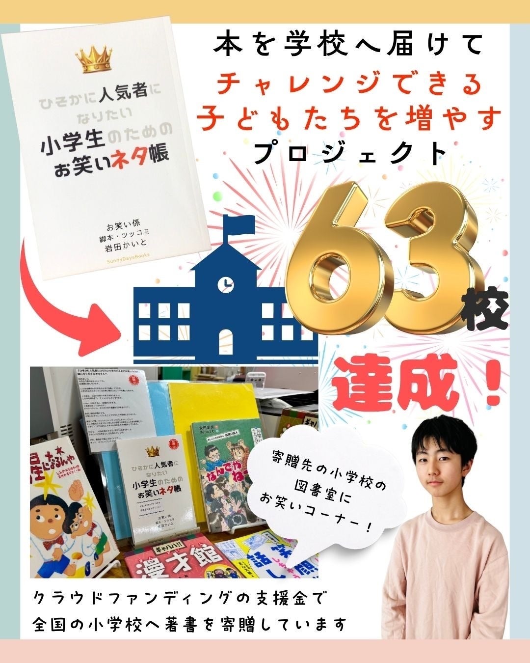 2026/02/20 06:18みなさんこんにちは!中学生作家のかいとです!突然ですが、お願いがあります!_______________________100校を目指しています________________________○本の寄贈をしてほしい!○寄贈先の紹介をしたいご協力いただけませんか?学校や、それ以外でも子どもたちが集まる場所への寄贈を続けています。もし、ご希望の方やご紹介いただける方がいらっしゃいましたらメッセージをください。チャレンジできる子どもたちを増やすプロジェクトの応援を引き続きよろしくお願いします! もっと見る今年もよろしくお願いします!