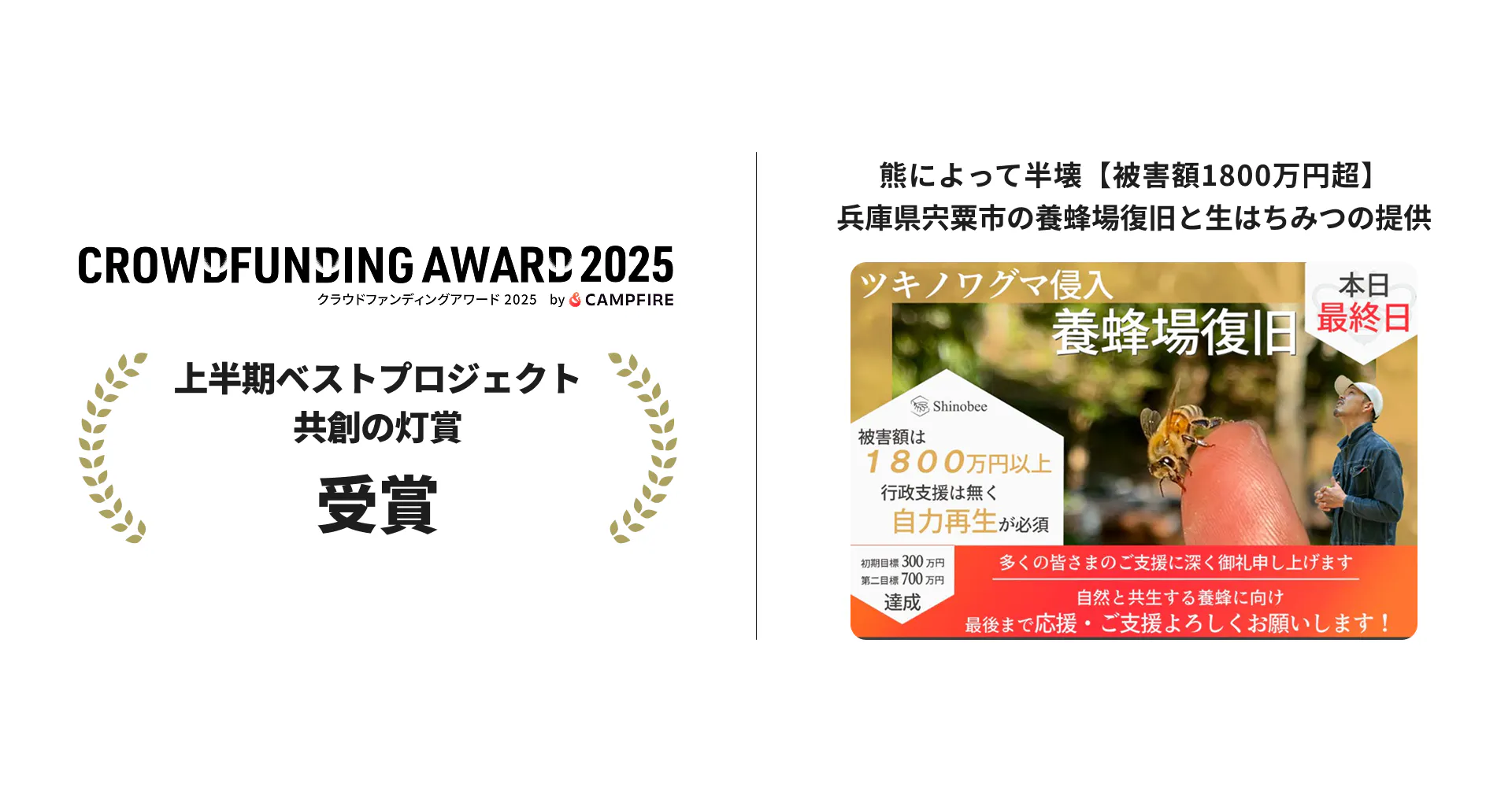 2026/01/07 09:37兵庫県宍粟市で養蜂業を営む Shinobee Honey です。このたび、「養蜂場復旧プロジェクト」が、「CAMPFIREクラウドファンディングアワード2025」 において、2025年ベストプロジェクト〈フード部門|共創の灯賞〉 を受賞いたしました。CAMPFIREに掲載された 14,467件 のプロジェクトの中から、わずか 約1.4% の一つとして選出いただいたこと。そして何より、被害の報を知り、声をかけ、支え、行動してくださった皆さまのおかげで、いま私たちは養蜂を続けることができています。この場を借りて、心より御礼申し上げます。CAMPFIREクラウドファンディングアワード2025 受賞のご報告今回受賞した「共創の灯賞」は、フード部門の中でも「共に創る」という姿勢が評価されたプロジェクトに贈られる賞です。この受賞は、決して私たちShinobee Honeyだけの成果ではありません。被害の報に心を寄せてくださった方、SNSで情報を広げてくださった方、リターンを通じて応援してくださった方。支援者お一人おひとりの想いが折り重なって灯った“共創の光” だと、深く感じています。ツキノワグマの侵入と、事業継続の危機2024年9月11日。私たちの養蜂場に、ツキノワグマが侵入しました。電気柵は破壊され、巣箱は倒され、長い時間をかけて育ててきたミツバチたちの養蜂場の半数近くが全滅 しました。被害額は機会損失も含めて 1,800万円超。翌2025年度の収穫量は、例年より 約1,000kg減少 する見込みとなり、養蜂業としての継続そのものが危ぶまれる状況でした。獣害に対する養蜂業への公的支援は、現実としてほとんどありません。それでも「来年もShinobeeさんのはちみつを楽しみにしている!」などといったお声に背を支えられ、もう一度この地で、ミツバチとともに生きる。その一心で、私たちはクラウドファンディングという手段を選びました。想いに支えられた、854万円という力プロジェクトの目標金額は 300万円。最終的に、854万8,820円 ものご支援が集まりました。数字としての大きさ以上に、そこに添えられていたメッセージ、励ましの言葉、「応援しています」「続けてください」という一つひとつのお声が、何度も心を支えてくれました。このプロジェクトは、単に 「被害を受けた養蜂場を救う」 だけの取り組みではなかったのだと思います。「自然と向き合う営みに、共に関わる」。そうした共創の形があったからこそ、今回の受賞に繋がったのだと感じています。自然と共にある、養蜂という営み兵庫県宍粟市は、町の面積の 9割以上が森林 に覆われた「森林王国」です。この深い山々の自然環境こそが、ミツバチたちの暮らす場所であり、香りと余韻のある生はちみつを生み出す源です。ミツバチは、山から湧く清らかな水を飲み、季節ごとに咲く花々から蜜と花粉を集めて生きています。私たちは、「ミツバチを養い、ミツバチと共に自然に寄り添って暮らす」 という姿勢を大切にしながら、日本の風土に合った国産はちみつを、これからも届け続けたいと考えています。日本のはちみつ自給率は、現在わずか 約5%。養蜂家の減少や高齢化が進む中で、持続可能な養蜂のあり方が、今あらためて問われています。熊と、自然と、どう向き合うか熊の被害というと、「熊が悪い存在」のように捉えられがちです。しかし本来、警戒心の強い熊が人里に現れる背景には、山の環境変化や餌場の減少など、人間側の営みも大きく関わっていると感じています。今回の出来事をきっかけに、電気柵の再設計、捕獲罠の連携体制の強化に加え、ミツバチが好む花や樹木を育てる取り組みも始めました。自然から距離を取るのではなく、どう共存するかを考え続けること。それもまた、養蜂家としての責任だと感じています。自然と向き合う仲間を募っています今回の出来事は、ひとつの養蜂場だけの問題ではなく、「山と人との距離がどう変わってきたのか」という、地域全体の問いでもあると感じています。Shinobee Honeyでは、熊の被害をきっかけに、電気柵や罠といった“守り”だけでなく、ミツバチが好む花や樹木を育てる「花織里プロジェクト|Beellage」を通じて、山に花を増やし、いきものたちの居場所を取り戻す取り組み を進めています。その歩みを、継続的に応援してくださる方とのオンラインコミュニティが、CAMPFIREコミュニティ内の「花織里プロジェクト|Beellage」です。熊やミツバチ、山のいきものたちと、どう共に暮らしていくか宍粟の四季や、ミツバチの一年の営み耕作放棄地を花のある風景へ変えていくプロセスなどを、現場からお届けしながら、一緒に「自然との付き合い方」を考えていく場にしていきたいと思っています。▶︎ コミュニティの詳細・ご参加はこちら花織里プロジェクト|Beellage(CAMPFIREコミュニティ)復旧、そして前へ皆さまからのご支援をもとに養蜂場の復旧を進め、一か所あたりの飼育群数を抑えた 分散飼育体制 へと移行しました。2025年春には新たなミツバチを迎え入れ、5月からは採蜜