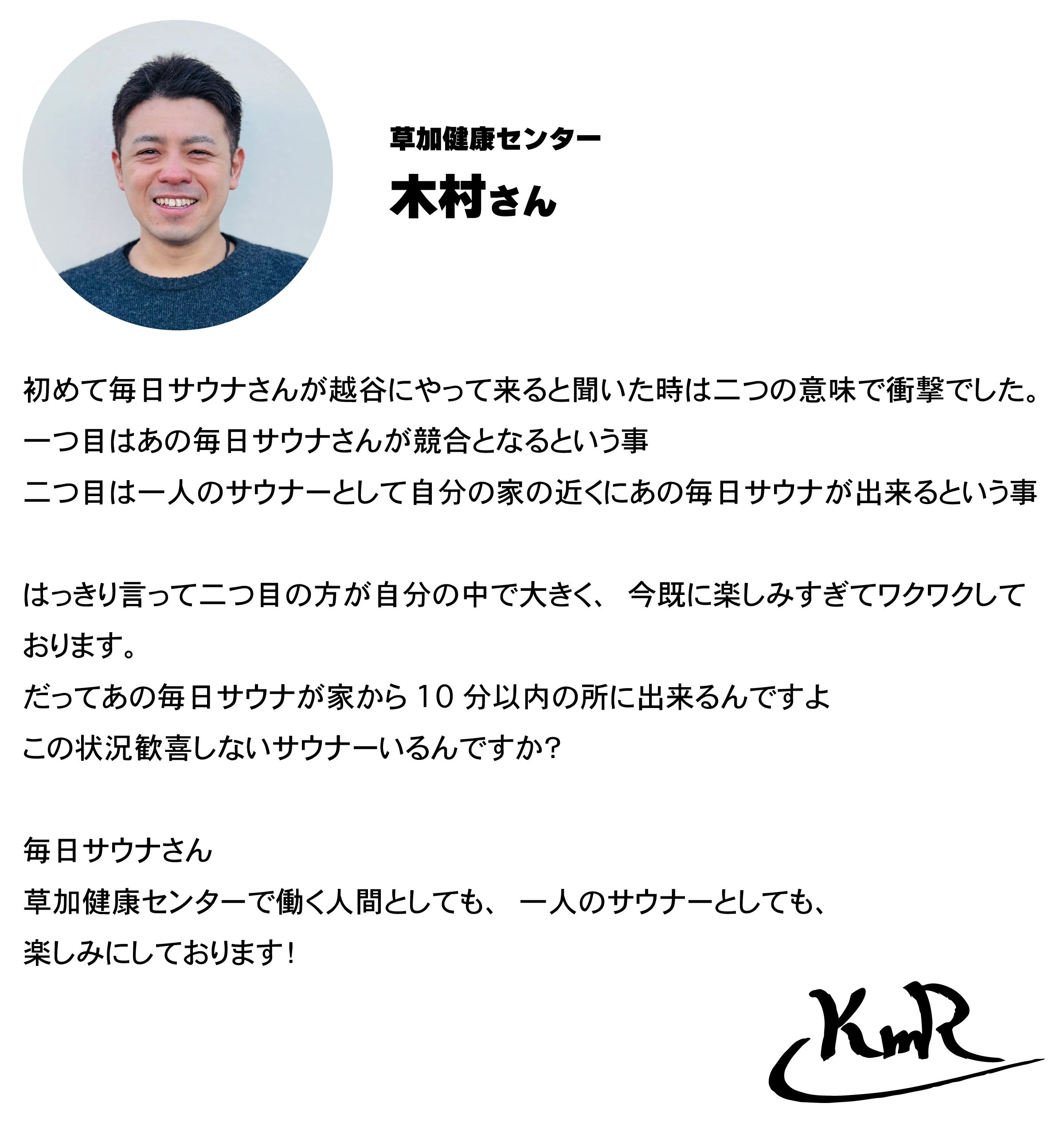 毎日サウナにご来店いただく皆さまは、サウナが好きなのはもちろんなのですが『施設を愛してくれている』ことが私は現場でお客様と携わる中で感じており、そういった方々と一緒に施設を作れることに私は非常に嬉しくワクワクしております。
