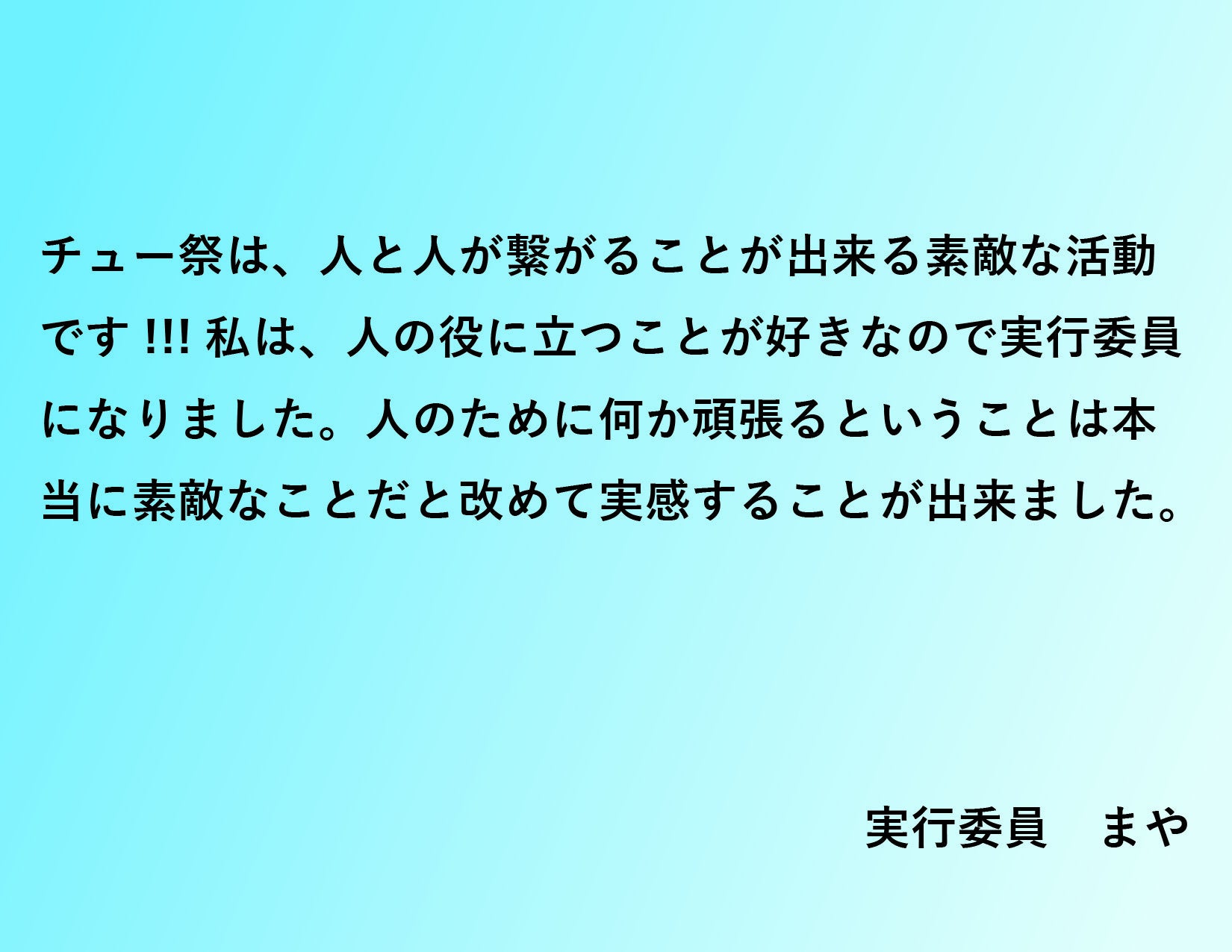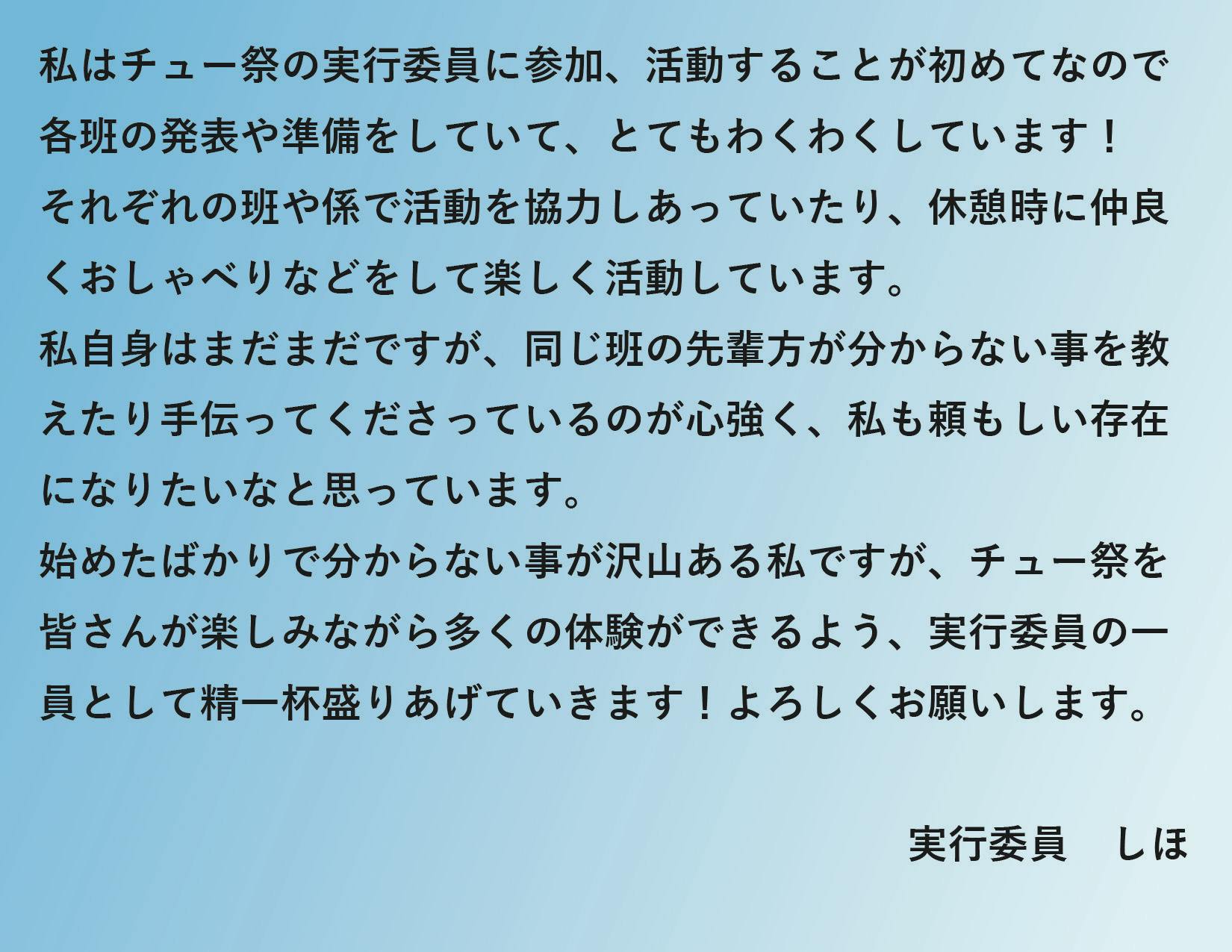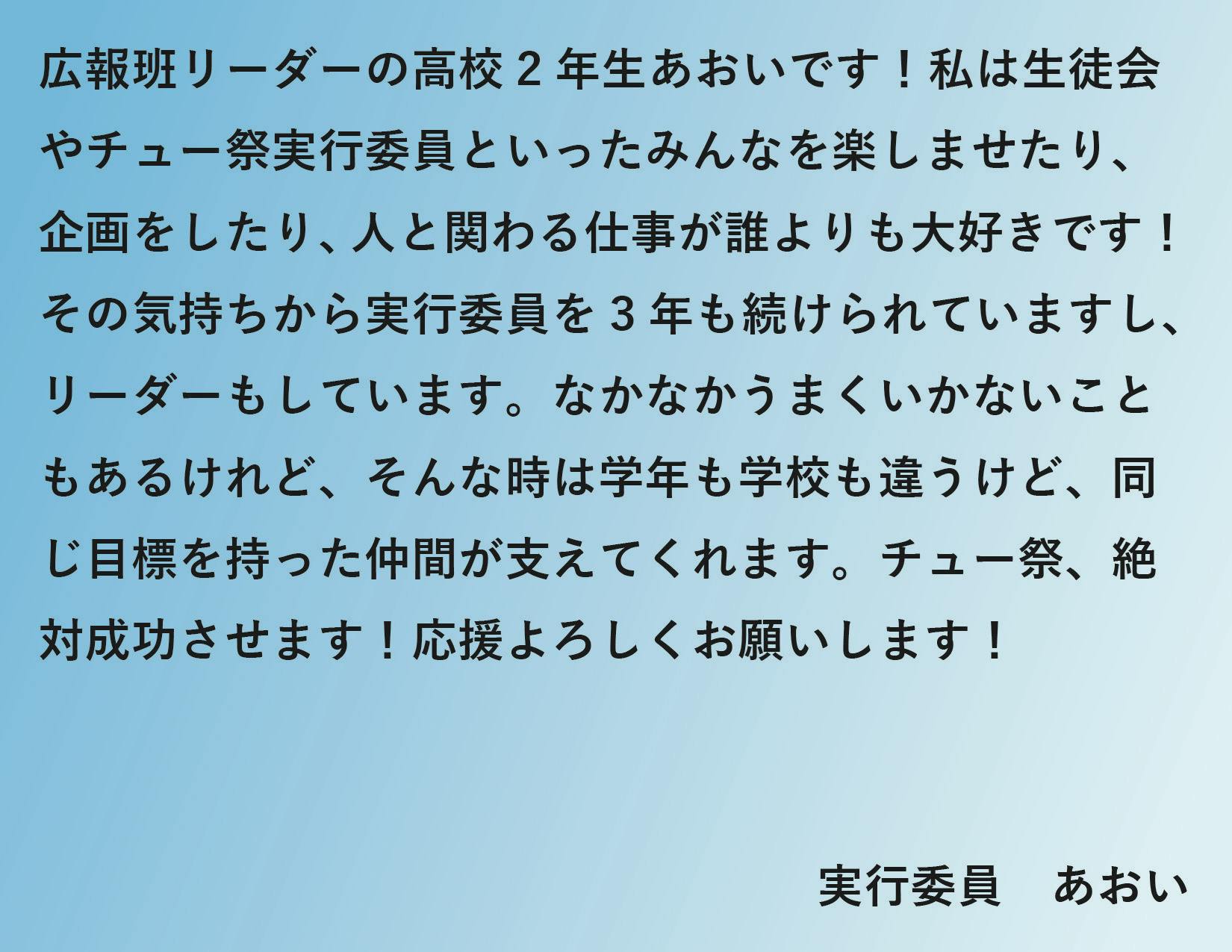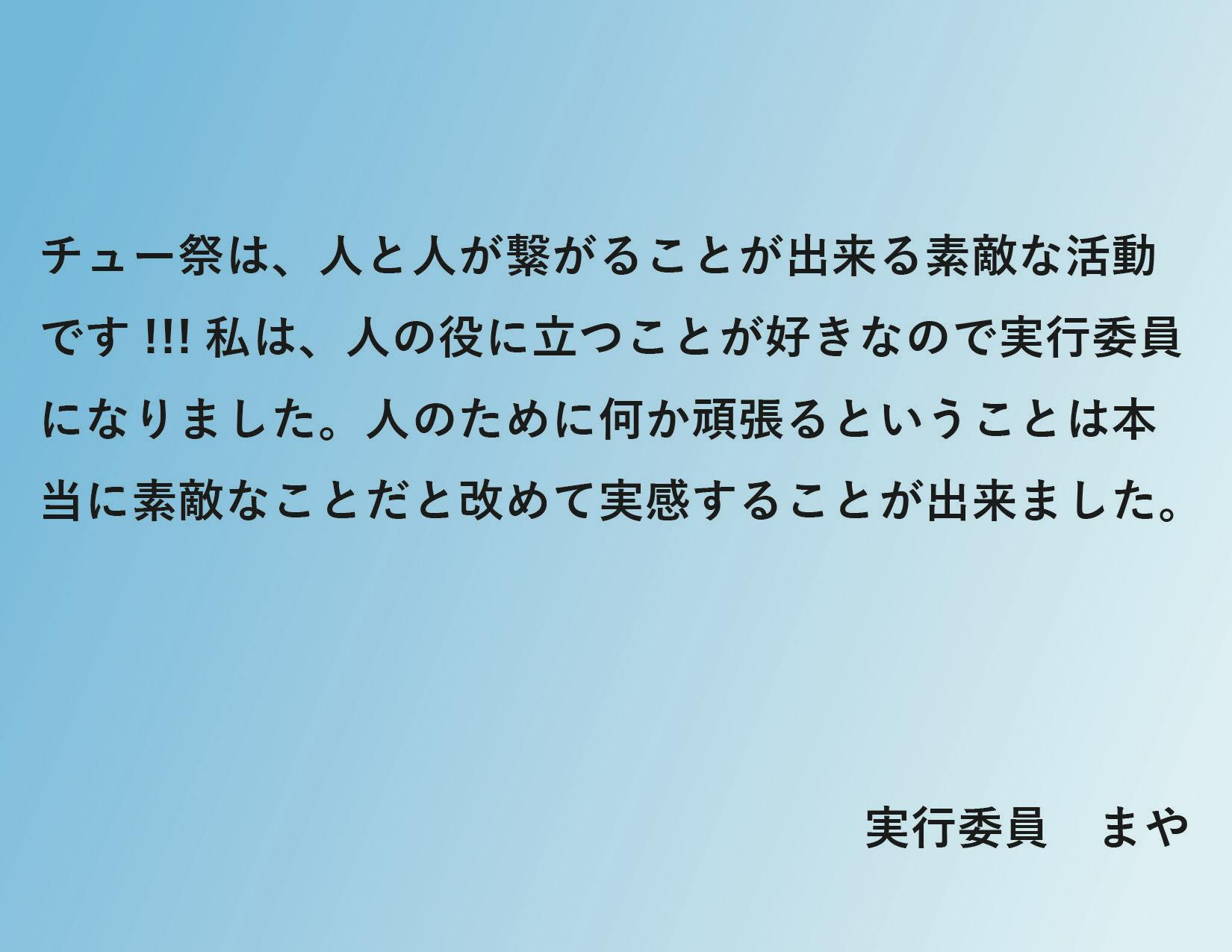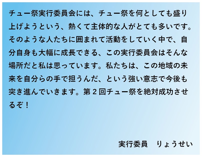 現在は、第2回チュー祭に向けて、第1回チュー祭以上の盛り上がりをみせる祭りを目指し日々活動をしています。