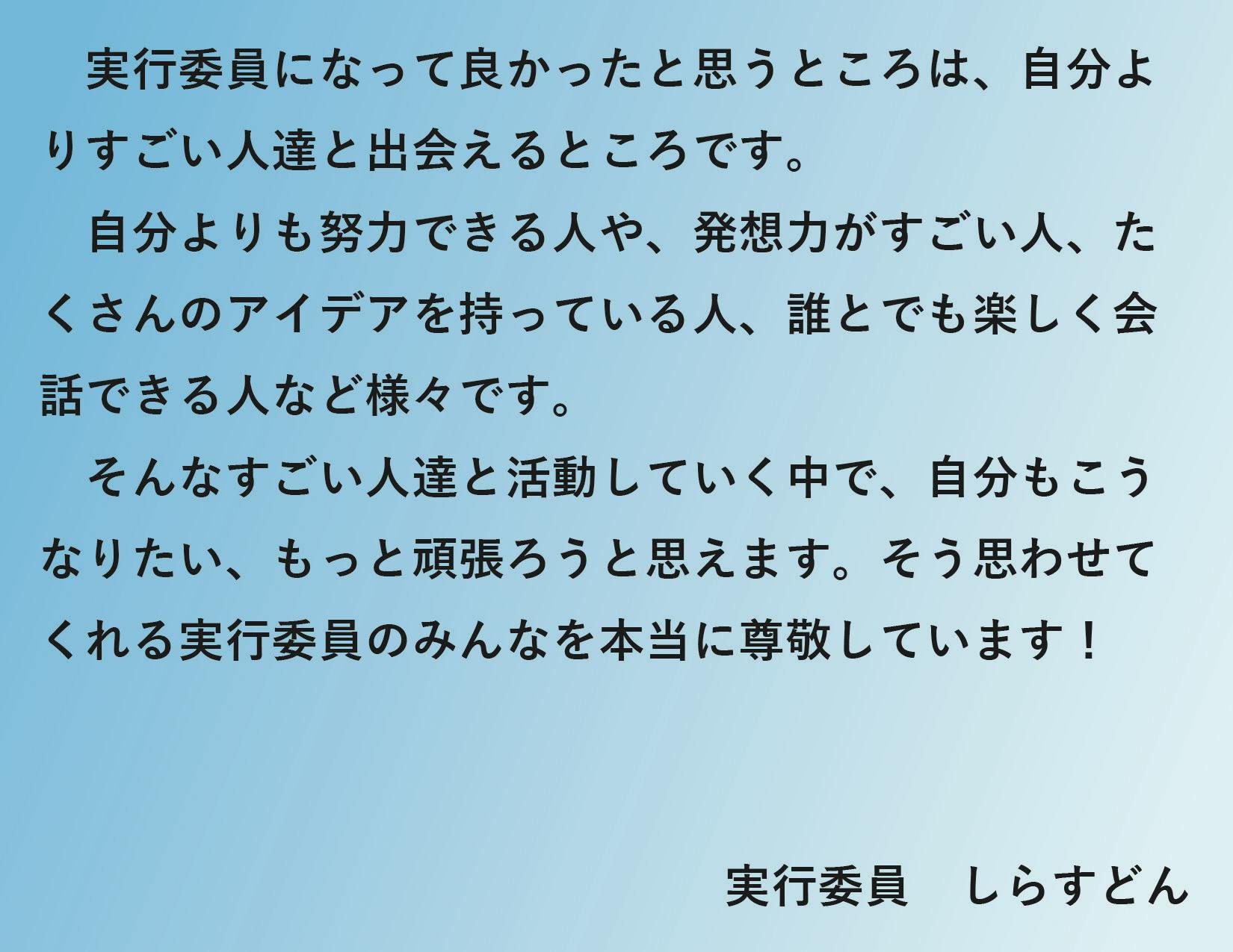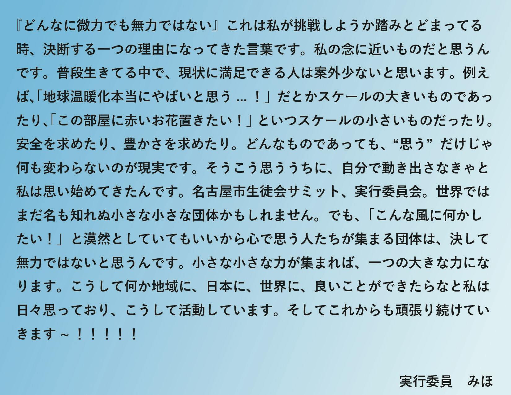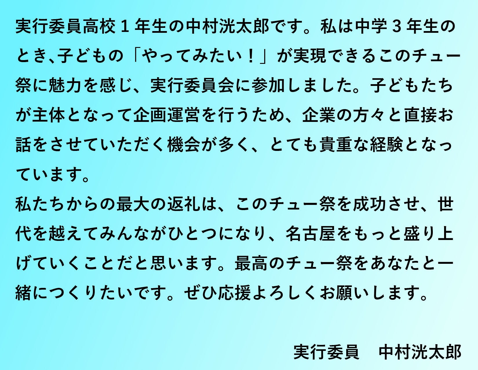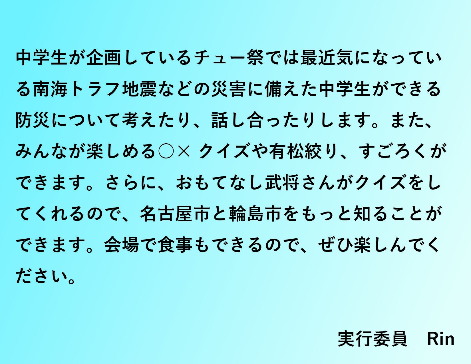 しかし、こんな時だからこそ、私たち名古屋市生徒会サミット実行委員は、同じ時代を生きる輪島市の中学生に想いを馳せ、つながりの形を模索し、そして、中学生の祭典「チュー祭」で共に未来に向けた防災アクションプランを作成したいと願っています。