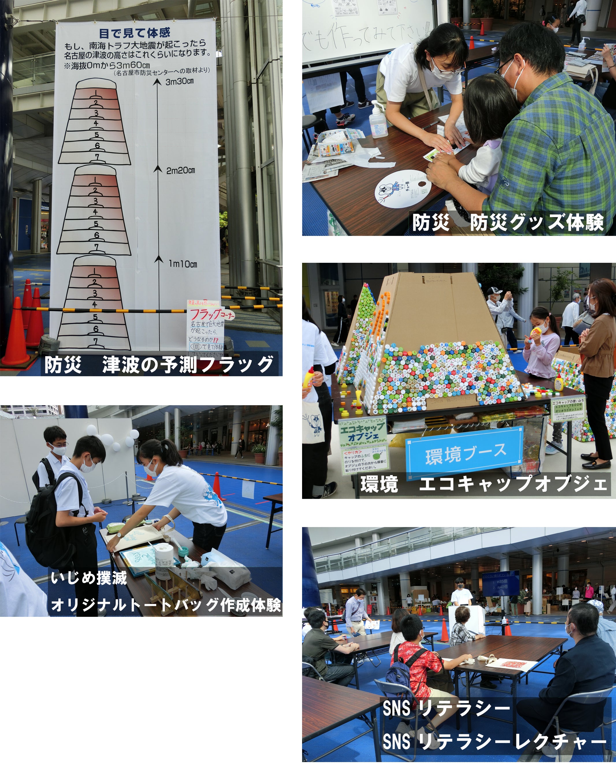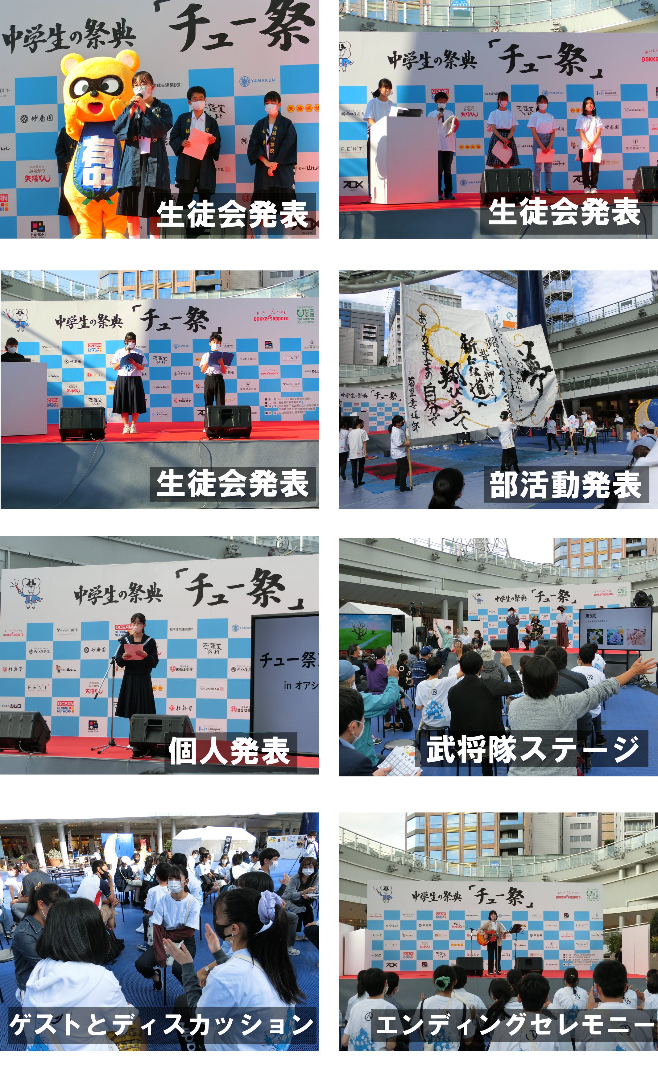 第1回中学生の祭典「チュー祭」では、防災・環境・いじめ撲滅・SNSリテラシー・名古屋もりあげ・コロナ禍からの教育の6つのブースで発表を行いました。その他にも、名古屋市検定クイズショー、ステージディスカッション「SDGsに向けてムーブメントを起こそう」や、生徒会発表、個人発表を行いました。