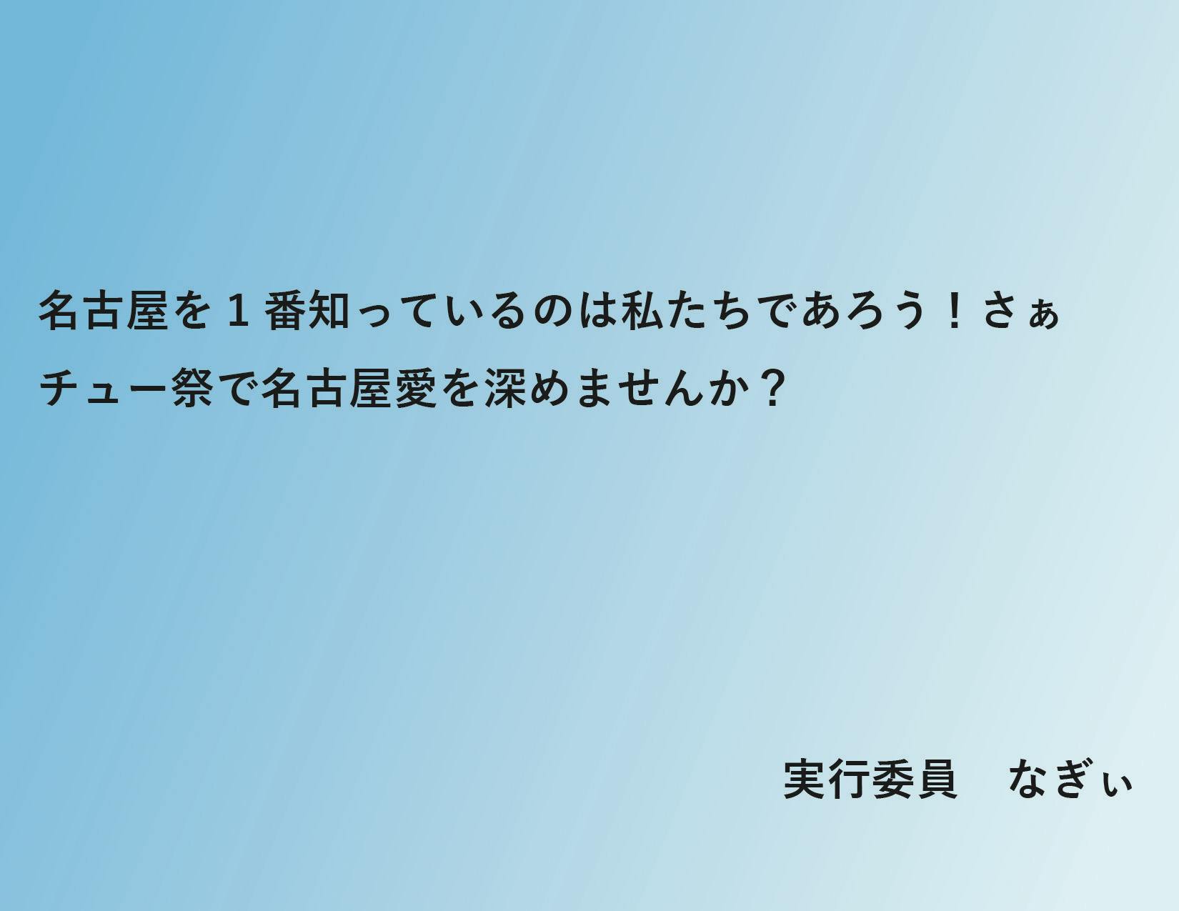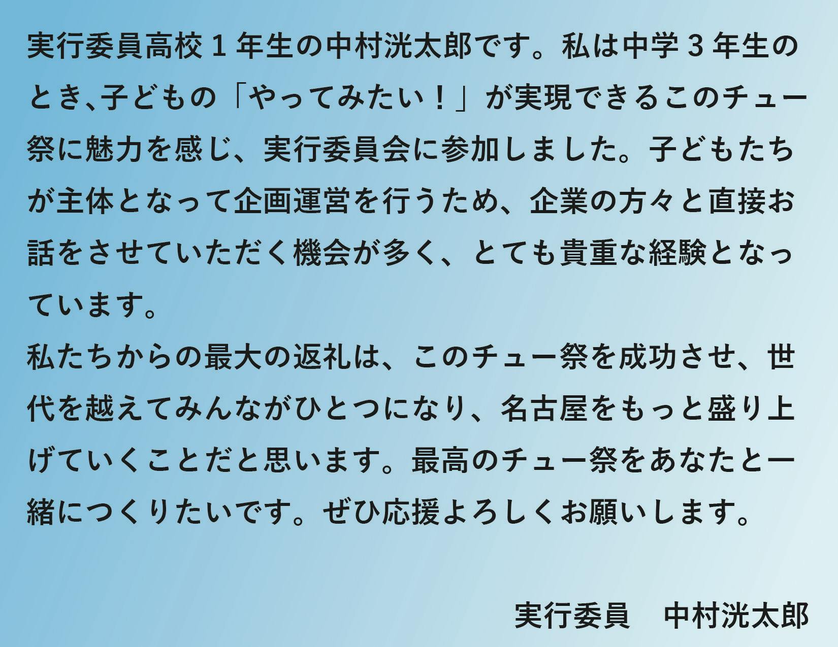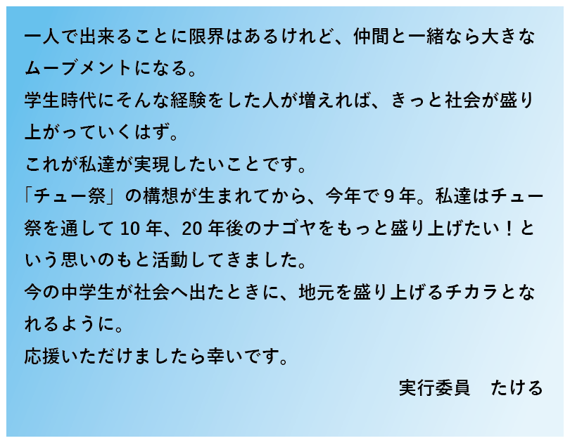 2015年に行った名古屋市生徒会サミットでひとつのグループから発表されたアクションプラン、中学生の祭典『チュー祭』は、「身近な課題から広く世界の課題まで、中学生が祭りを起こして解決しよう!」というものでした。同年、6名の中学生が実行委員を立ち上げ、2024年現在では60名を超える大所帯になりました。