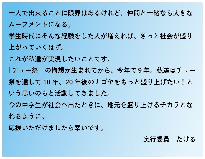 2015年に行った名古屋市生徒会サミットでひとつのグループから発表されたアクションプラン、中学生の祭典『チュー祭』は、「身近な課題から広く世界の課題まで、中学生が祭りを起こして解決しよう!」というものでした。同年、6名の中学生が実行委員を立ち上げ、2024年現在では60名を超える大所帯になりました。