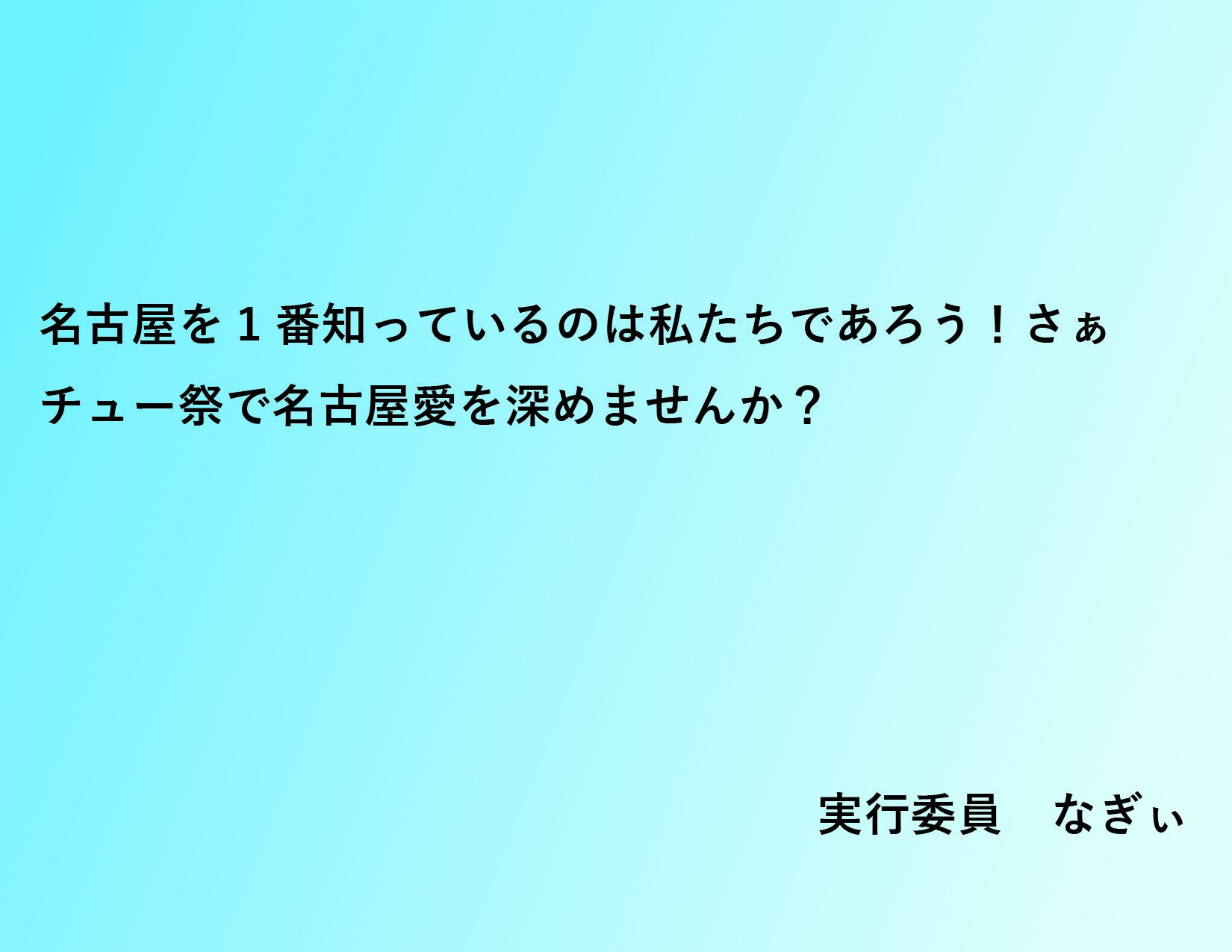 名古屋には、世の中にはまだあまり知られていない魅力がたくさん詰まっています。このイベントを通して名古屋の魅力を世に伝え、若い私たちの手で地元名古屋を盛り上げていきます。「名古屋とばしとはもう言わせない!」ふるさとを愛する子どもたちの手で名古屋愛を全国に発信します!