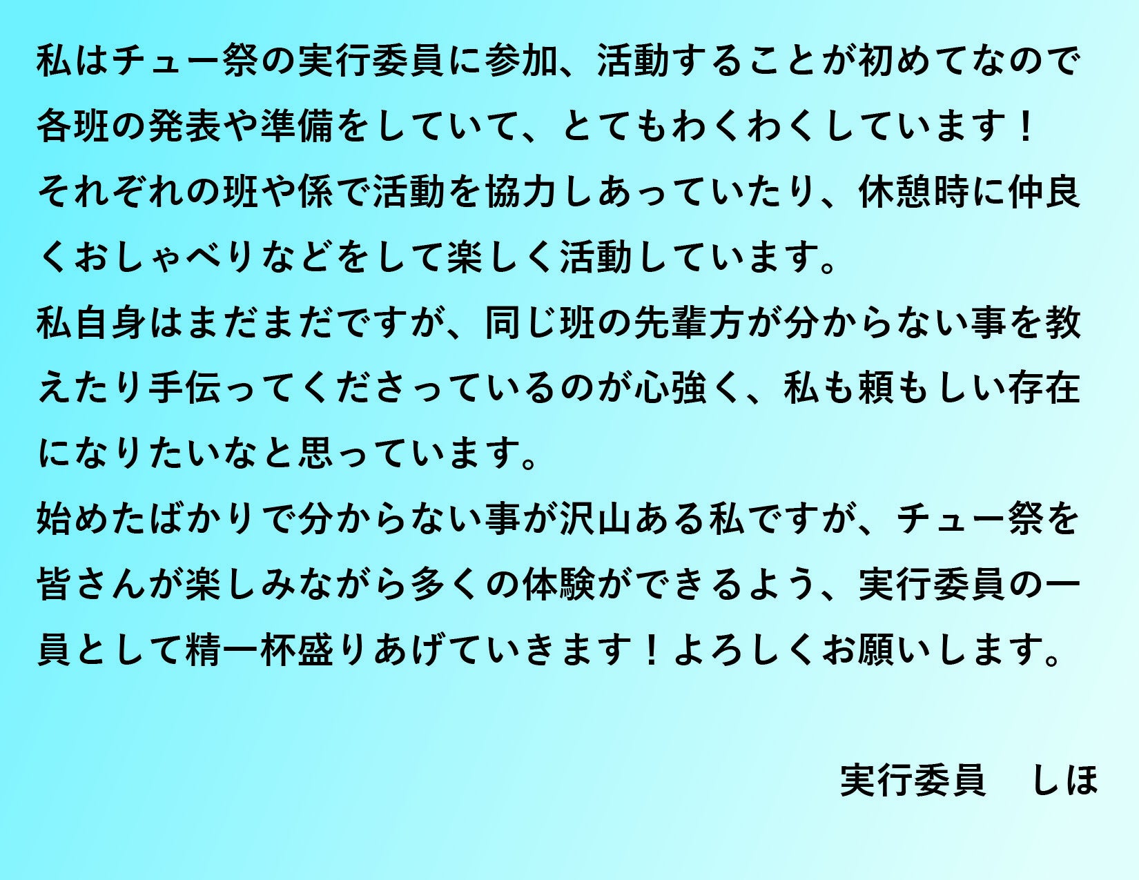現在は、第2回チュー祭に向けて、第1回チュー祭以上の盛り上がりをみせる祭りを目指し日々活動をしています。