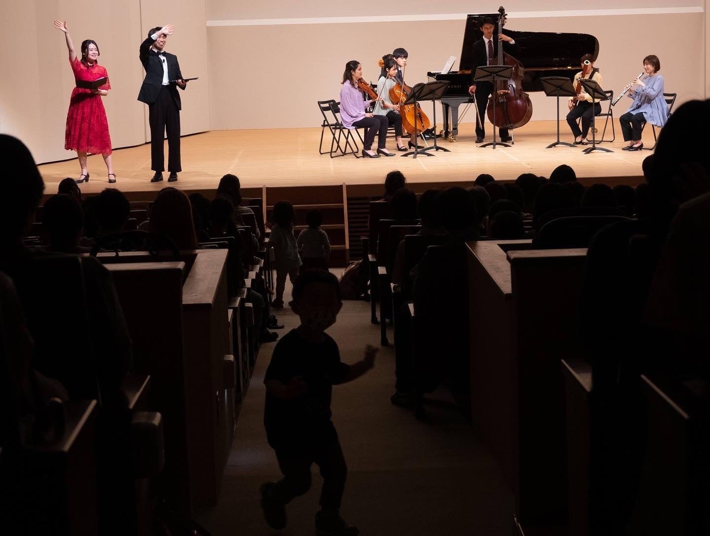 テーマは『⽣の楽器の⾳・歌声に触れ、⽿で聴いて⼼で感じて⾳楽を全⾝で体感しよう!』トークや各楽器の紹介などを交えながら、⽣の楽器の⾳⾊やクラシック⾳楽の名曲の数々の響きを体感して頂きました。