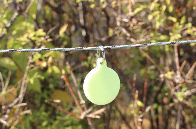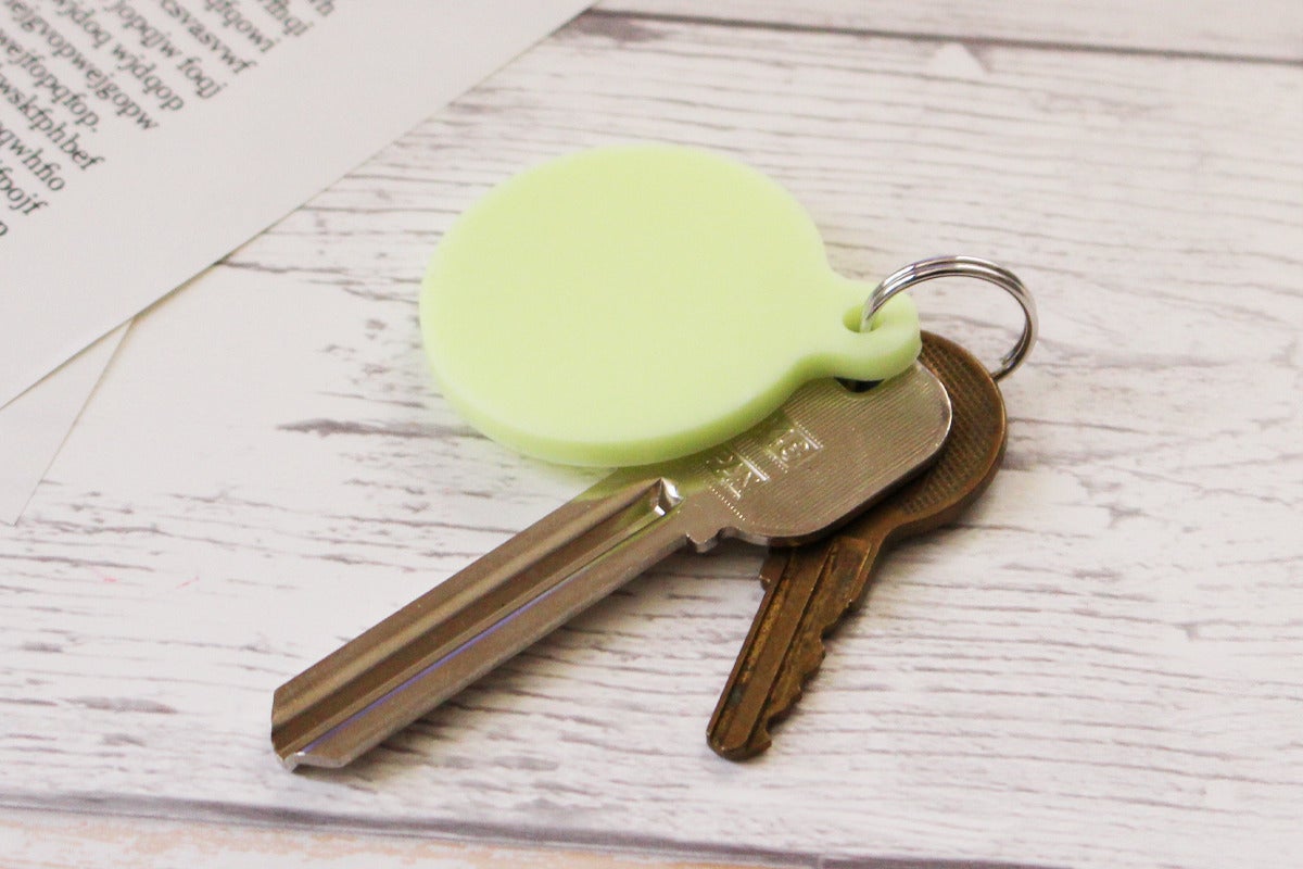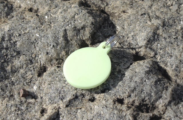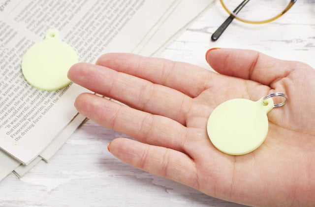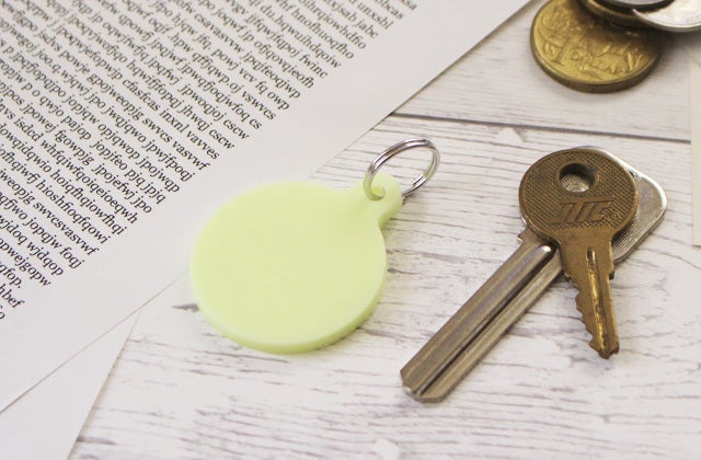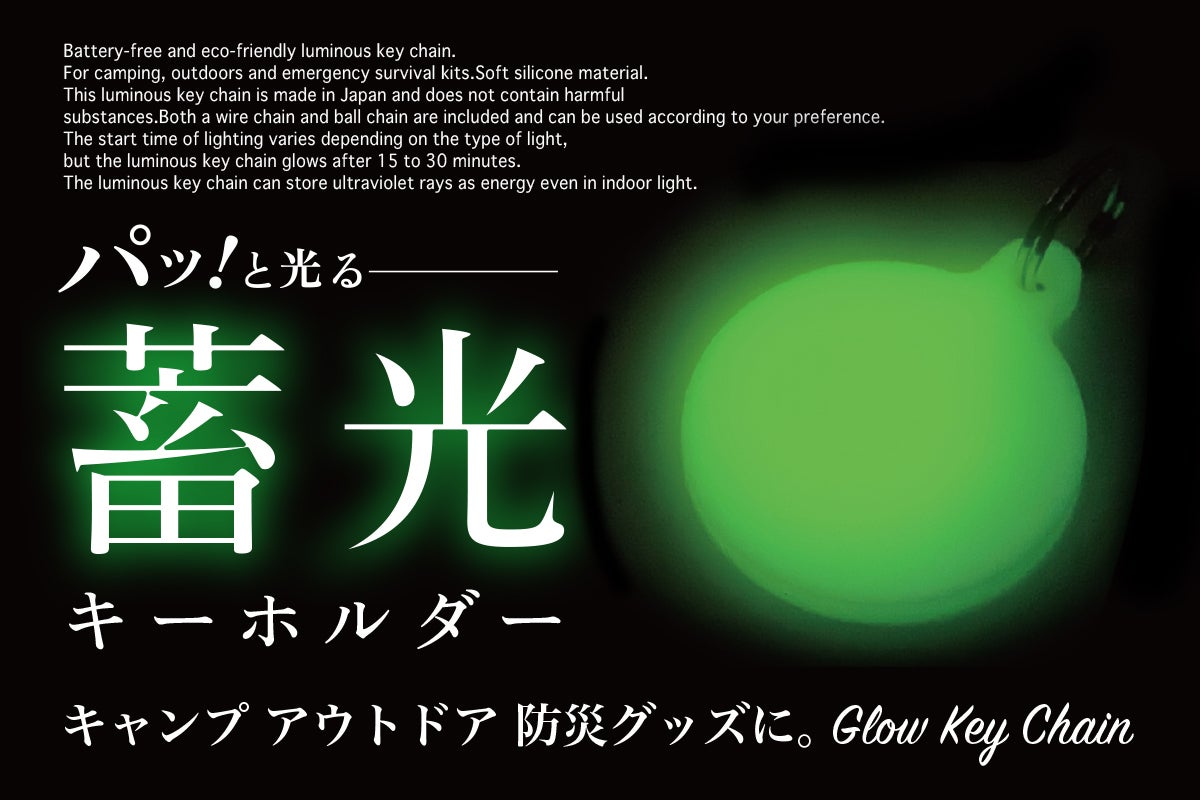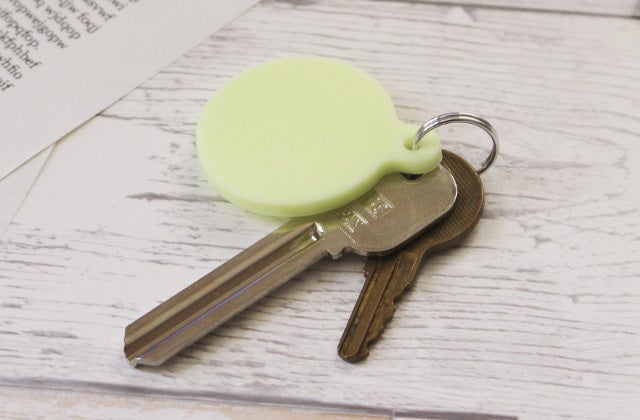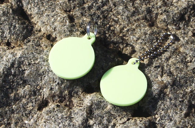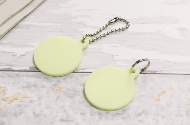 太陽光や室内の光に当てることで、何時間もわたって発光する電池不要のエコな蓄光キーホルダーです。「うすい丸型」!面積も広いので目にも留まりやすく、暗いところでの目印になります。