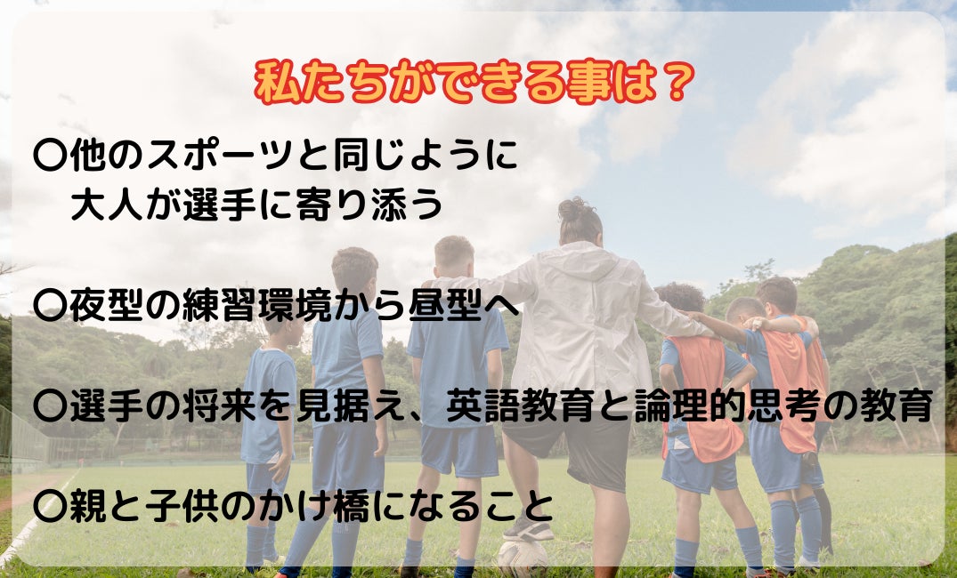 生活リズムに配慮した練習環境の整備(スクリムの運営)を進めています。また、親と子供の悩みを解決していく為