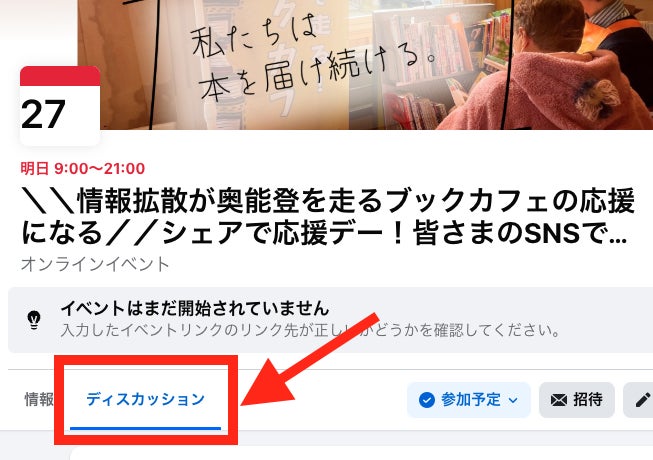 シェアをいただけたら、こちらのイベントページのディスカッションのところに「シェアしたよ」の報告をお願いします。