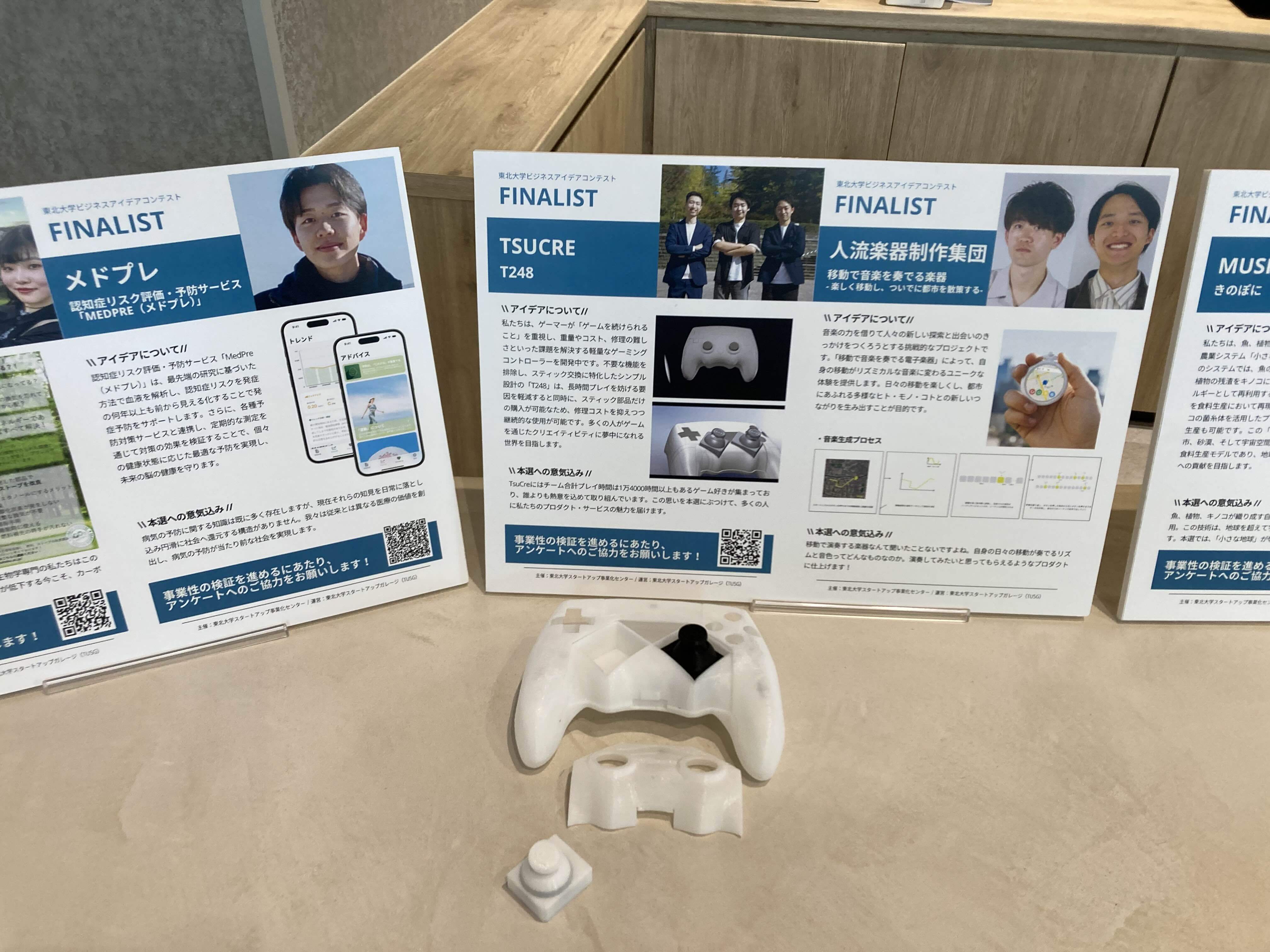 2024年12月には東北大学ビジネスアイデアコンテストに出場し、最優秀賞とものづくり部門賞を獲得しました(詳しくはこちら)。このビジコンではCGを用いた製品動画と3Dプリンターを使ったプロトタイプを披露し、多くの観客から反響を得ました。