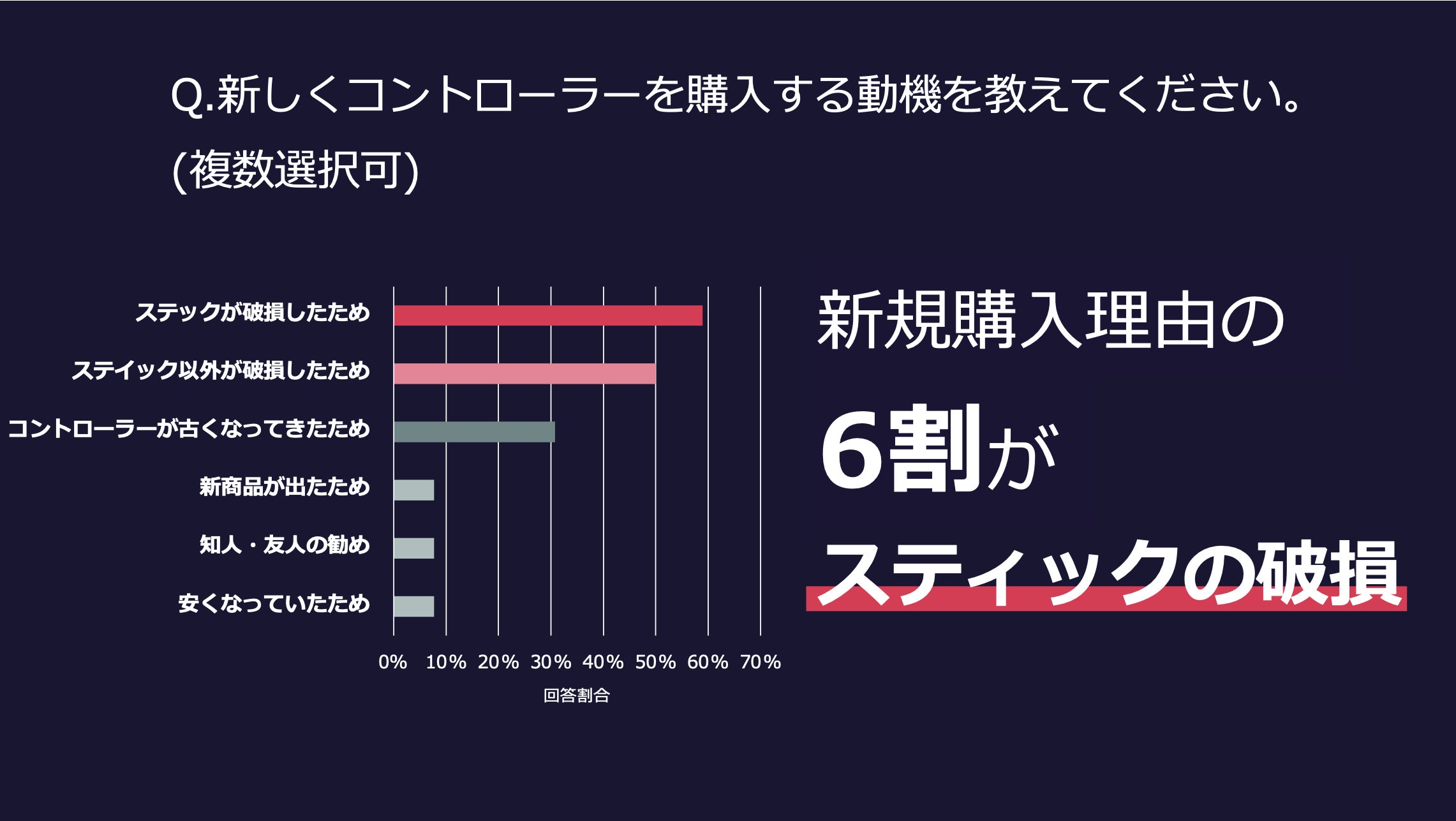 さらに、私たちが実施した独自のアンケート調査では、約6割のゲーマーがスティックの故障を理由にコントローラーを買い替えていることが判明しました。