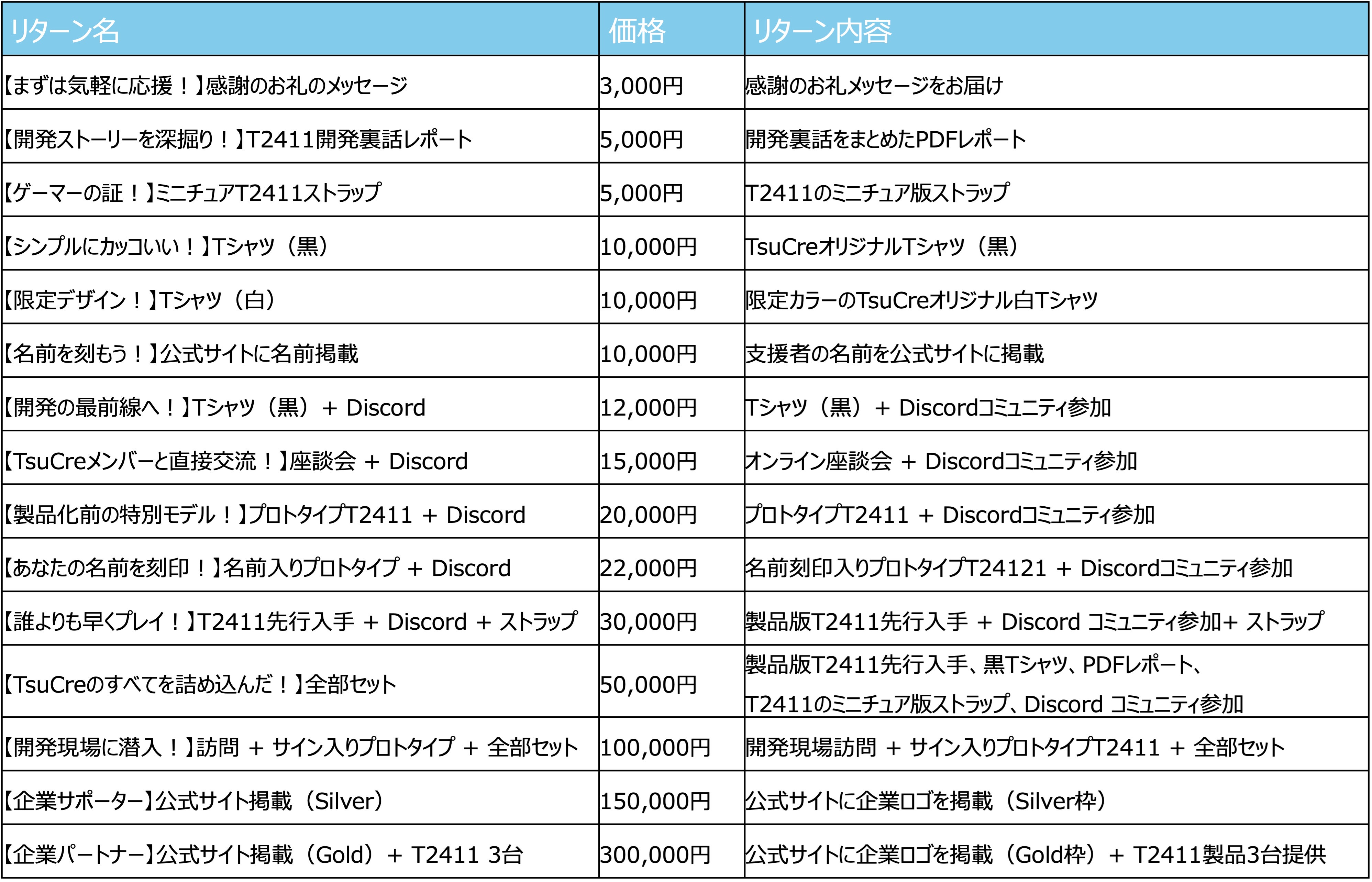 私たちTsuCreの挑戦に共感し、支えてくださる皆さまに向けて、気軽な応援から特別な体験まで幅広いリターンプランをご用意しました。ゲーマーとしてのこだわりや、ものづくりへの情熱を込めたリターンです。