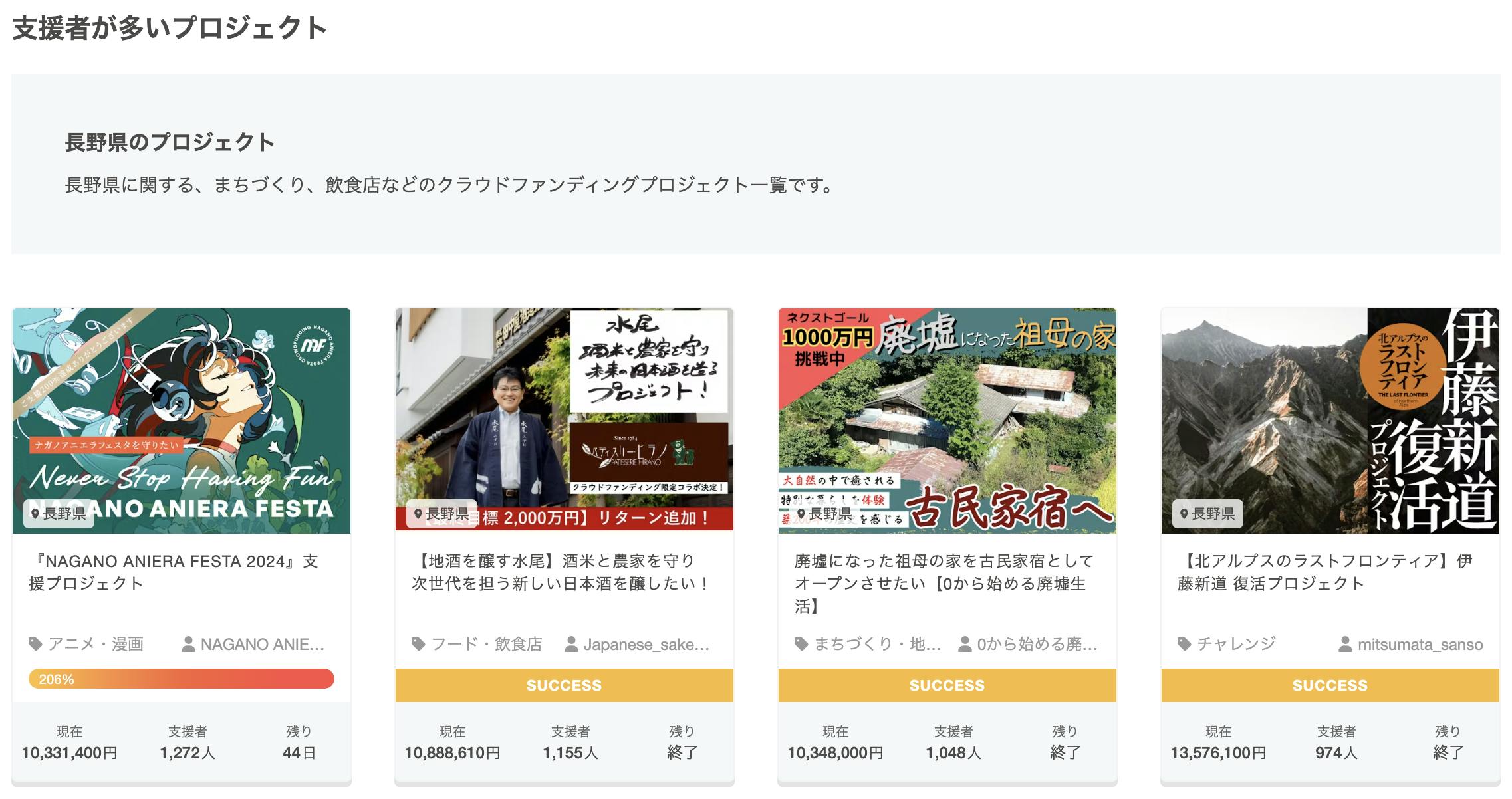 皆様のご支援のおかげで、CAMPFIRE内の地域を長野県で登録されているプロジェクトの中で、歴代1位の支援者数になりました。