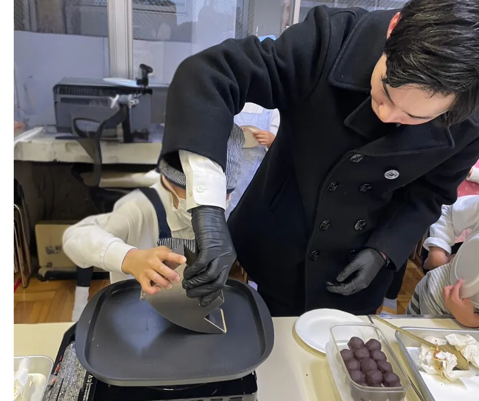 子ども達にも伝統菓子の源氏巻をつくってもらい、楽しく提供。