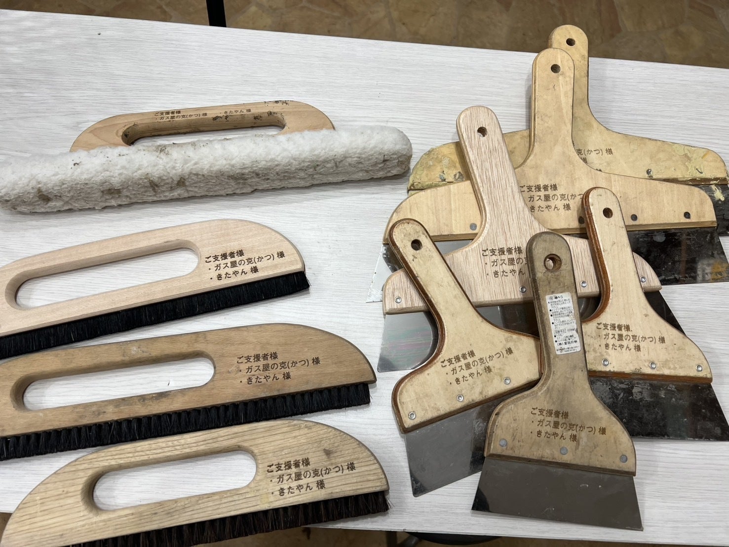 内装講座で使われるヘラ(大小)、ブラシ、パテベラにレーザー彫刻機で彫刻させていただきました。