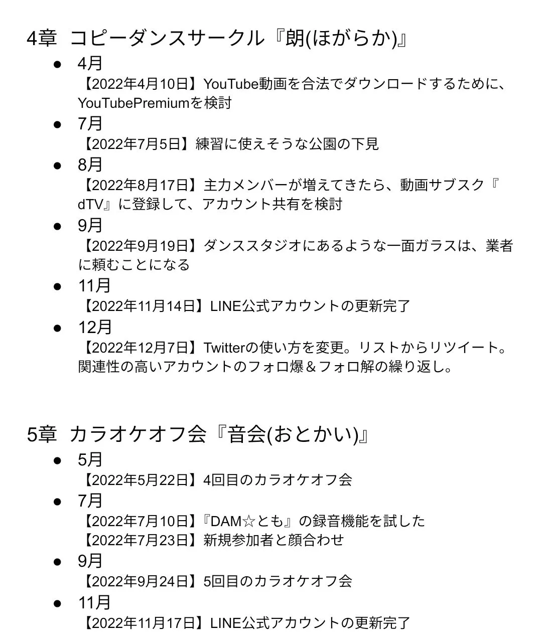 コピーダンスサークルに関しては、一時は40人以上のメンバーが同時参加しており、地域のダンスイベントに参加したり自主イベントを開催していました。しかし、金銭面などの理由が重なり、活動休止状態です。縛りカラオケオフ会に関しては、カラオケ店でUVERworldのみのカラオケオフ会を8人程度で開催したことはありました。しかし、現状は、活動内容に賛同するメンバーが増えなかったりと、ほぼ活動休止状態です。